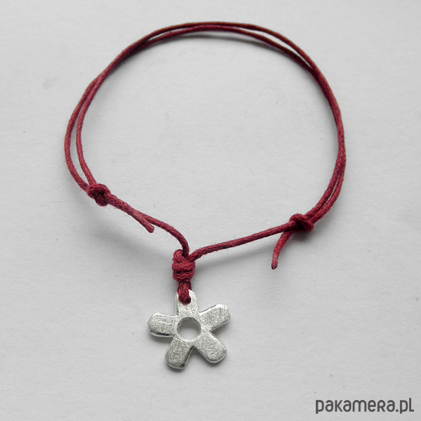 KWIAT bransoletka Efektowny, nowoczesny, a zarazem romantyczny dodatek. KWIAT to uroczy i delikatny wzór. Bransoletka wykonana jest z: srebro, ozdobny sznurek. Srebro - zmatowione. Długość zawieszki - ok. 1,5 cm. Szerokość zawieszki - ok. 1,5 cm. Istnieje możliwość wykonania bransoletki w innym kolorze sznurka.
