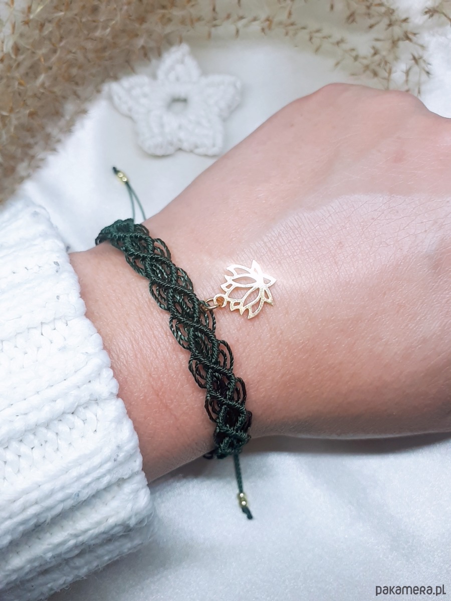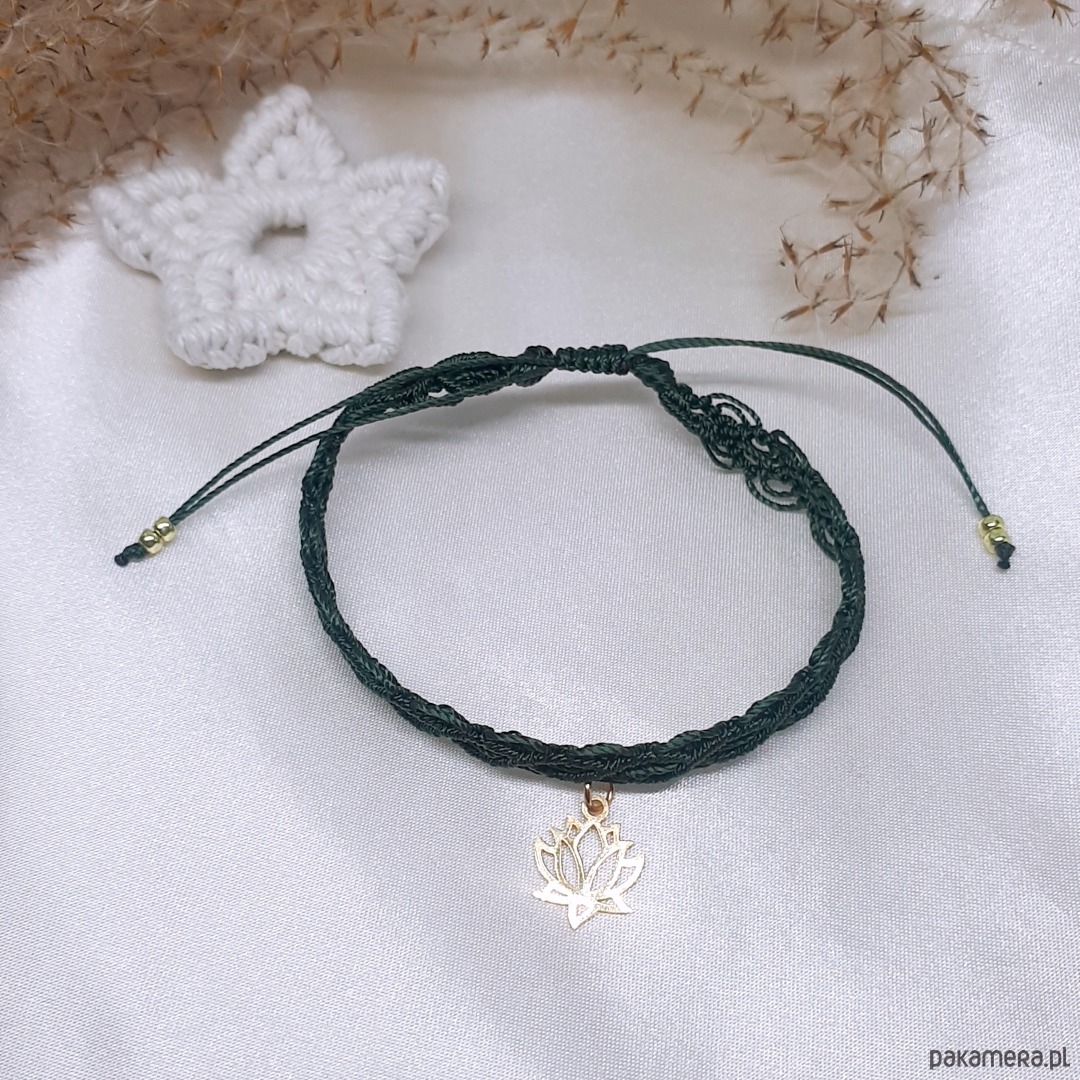 Delikatna bransoletka damska posiada ażurowy pasek wypleciony w technice makramy z nici jubilerskich wysokiej jakości. Pasek jest w kolorze nasyconej zieleni. Zawieszka - kwiat lotosu - jest wykonana ze stali chirurgicznej w kolorze złotym.