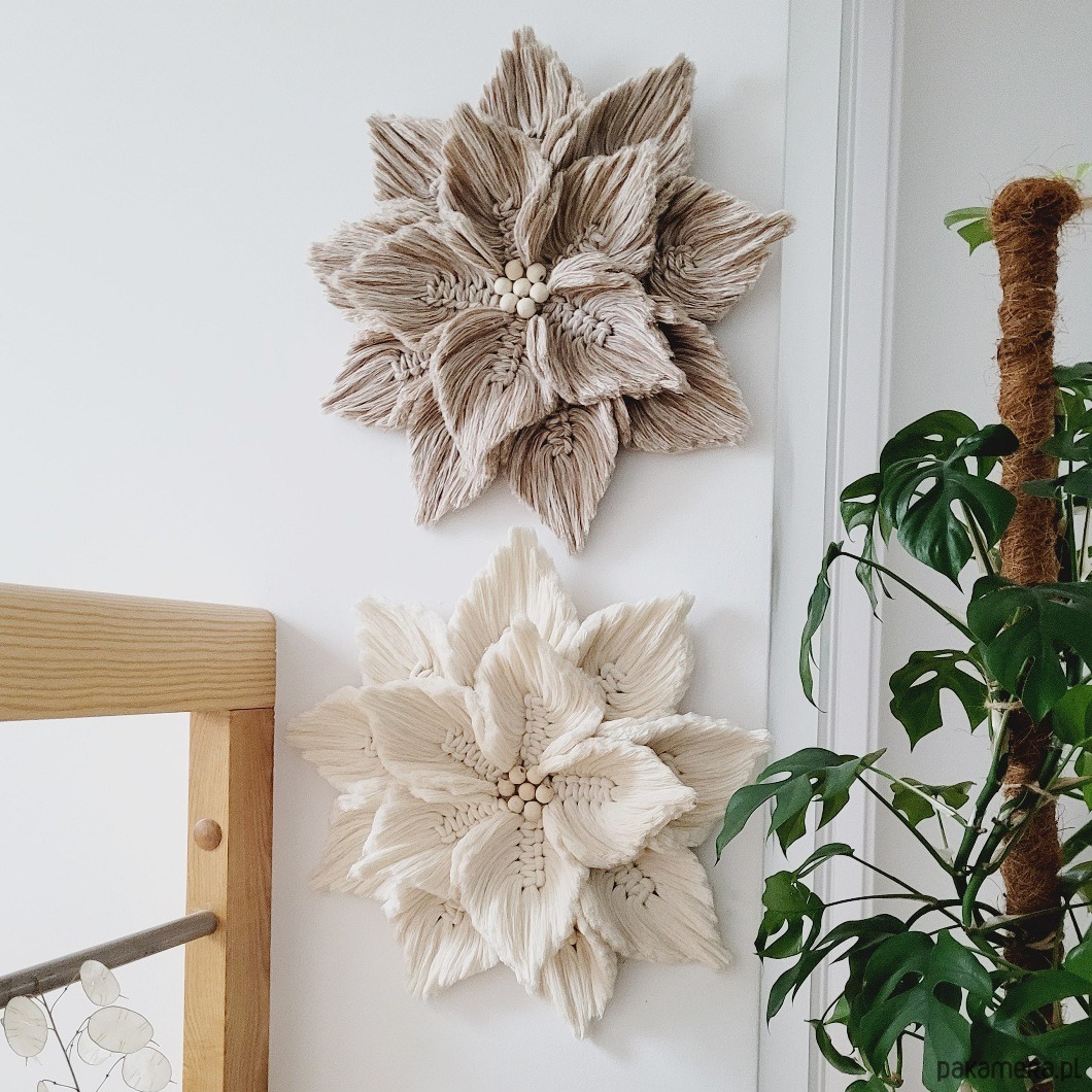 Dwa kwiaty o średnicy około 40 cm, wykonane metodą makramy ze sznurka bawelnianego w kolorze jeans i w kolorze cielistym.