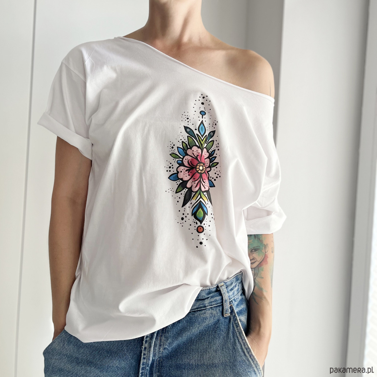 Delikatny, lekki, wysmukły wzór kwiatowy na białej koszulce. Czego chcieć więcej?
