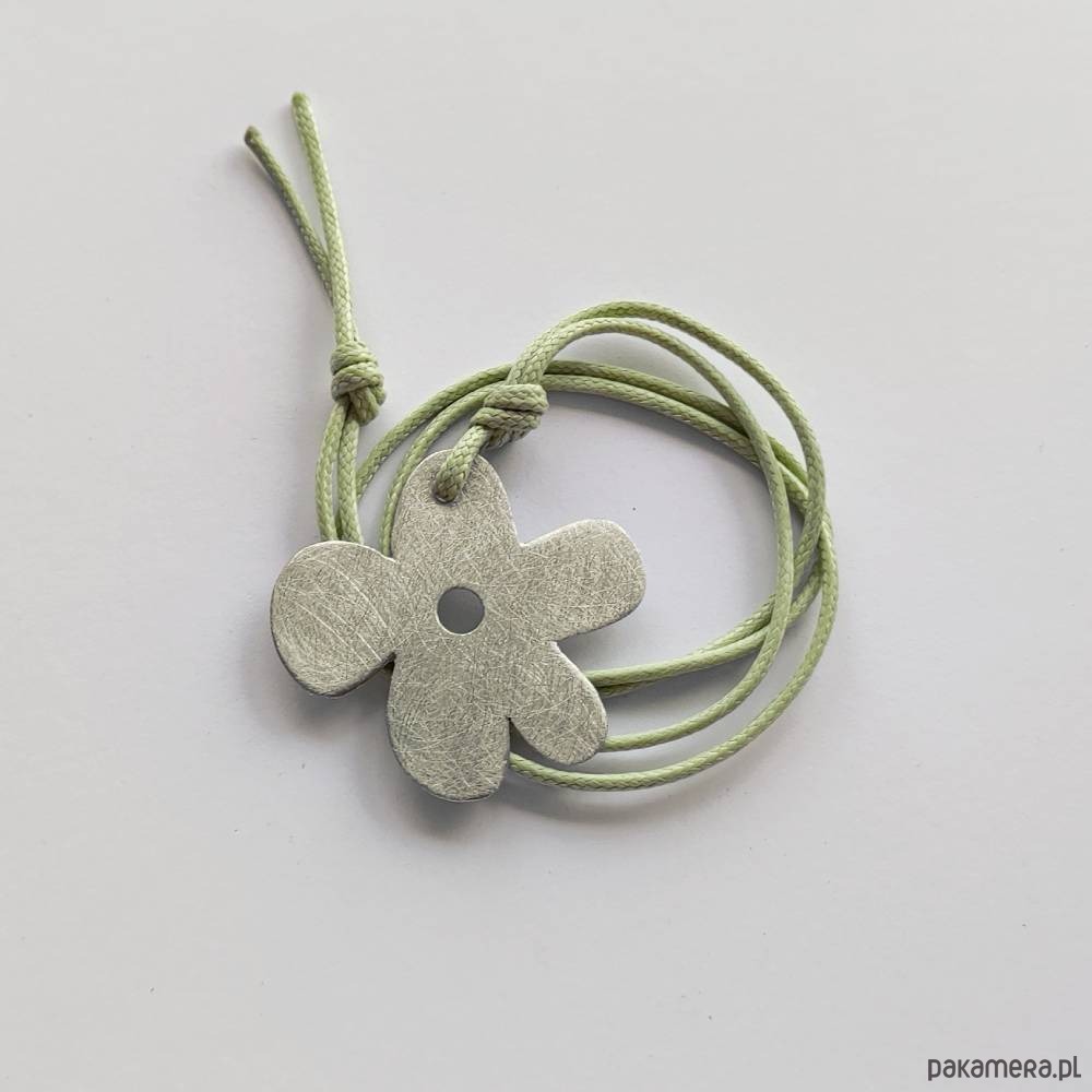 Efektowny, nowoczesny, a zarazem romantyczny dodatek. KWIAT to uroczy i delikatny wzór. W wyjątkowy sposób łączy on ażur z metalem, który przyciąga wzrok jak mało która ozdoba. Wisiorek wykonany jest z -alpaki, ozdobny sznurek.Alpaka : zmatowiona. Długość sznurka - 70 cm. Długość zawieszki - 4,3cm. Szerokość zawieszki - 4 cm.
