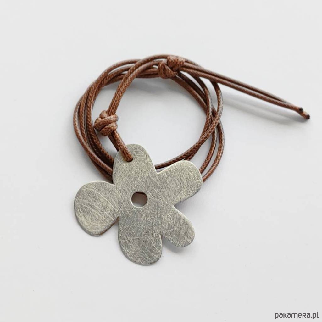 Efektowny, nowoczesny, a zarazem romantyczny dodatek. KWIAT to uroczy i delikatny wzór. W wyjątkowy sposób łączy on ażur z metalem, który przyciąga wzrok jak mało która ozdoba. Wisiorek wykonany jest z -alpaki, ozdobny sznurek.Alpaka : zmatowiona. Długość sznurka - 70 cm. Długość zawieszki - 4,3cm. Szerokość zawieszki - 4 cm.