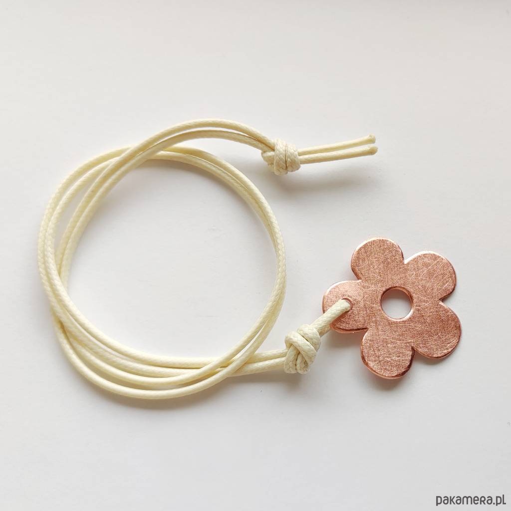 Efektowny, nowoczesny, a zarazem romantyczny dodatek. KWIAT to uroczy i delikatny wzór. W wyjątkowy sposób łączy on ażur z metalem, który przyciąga wzrok jak mało która ozdoba. Wisiorek wykonany jest z -miedź, ozdobny sznurek. Miedź: zmatowiona. Długość sznurka - 70 cm. Długość zawieszki - 3,5cm. Szerokość zawieszki - 3,5 cm.