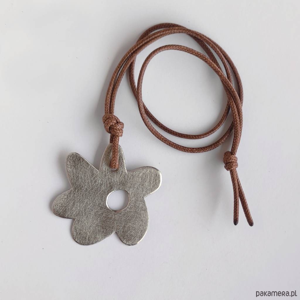 Efektowny, nowoczesny, a zarazem romantyczny dodatek. KWIAT to uroczy i delikatny wzór. W wyjątkowy sposób łączy on ażur z metalem, który przyciąga wzrok jak mało która ozdoba. Wisiorek wykonany jest z -alpaki, ozdobny sznurek. Alpaka : zmatowiona. Długość sznurka - 70 cm. Długość zawieszki - 5,2 cm. Szerokość zawieszki - 4,8 cm.