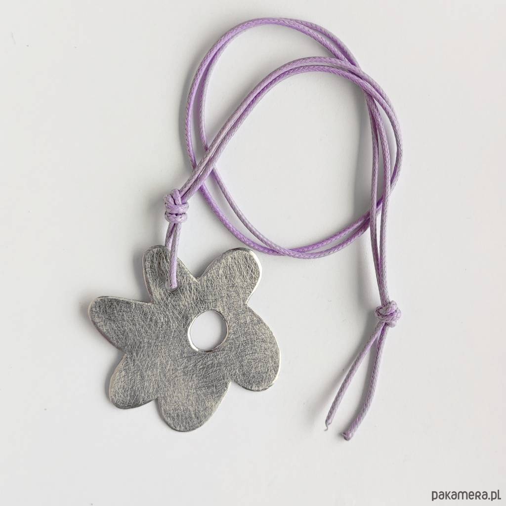 Efektowny, nowoczesny, a zarazem romantyczny dodatek. KWIAT to uroczy i delikatny wzór. W wyjątkowy sposób łączy on ażur z metalem, który przyciąga wzrok jak mało która ozdoba. Wisiorek wykonany jest z -alpaki, ozdobny sznurek. Alpaka : zmatowiona. Długość sznurka - 70 cm. Długość zawieszki - 5,2 cm. Szerokość zawieszki - 4,8 cm.