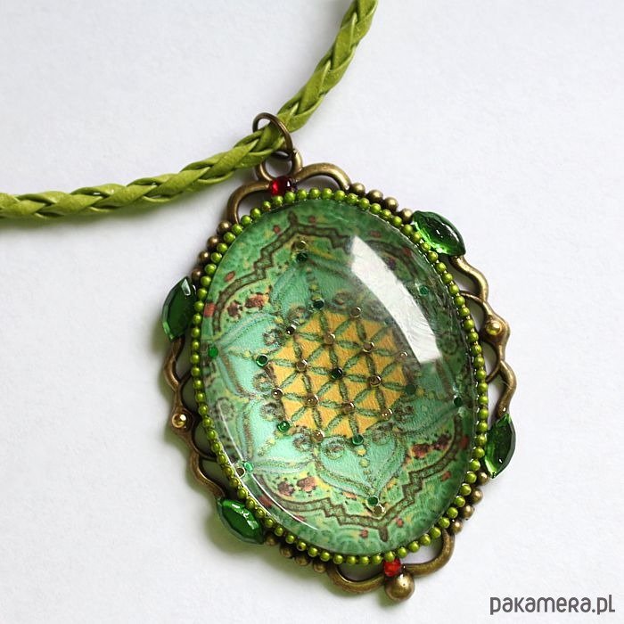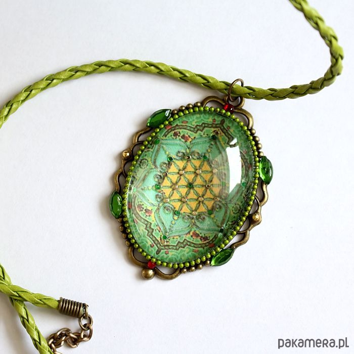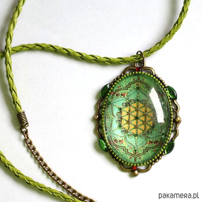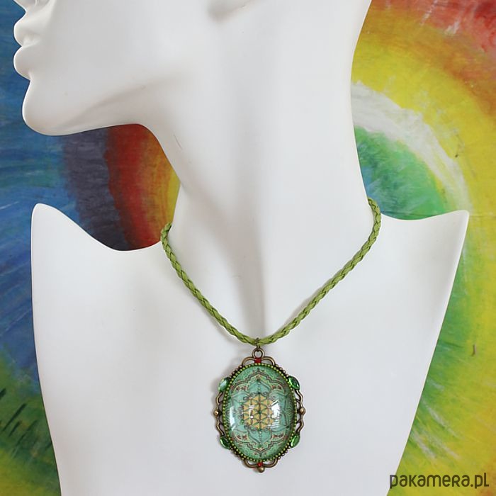 Elegancki talizman Obfitości, energetyczny wisior na stylowej bazie w odcieniu antycznego złota ze szklanym kaboszonem, ozdobionym oryginalną mandalą energetyczną KWIAT ŻYCIA oraz cyrkoniami.