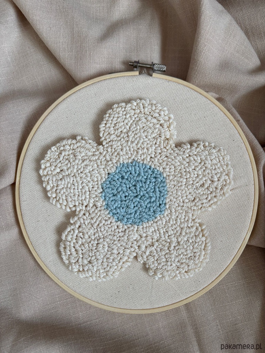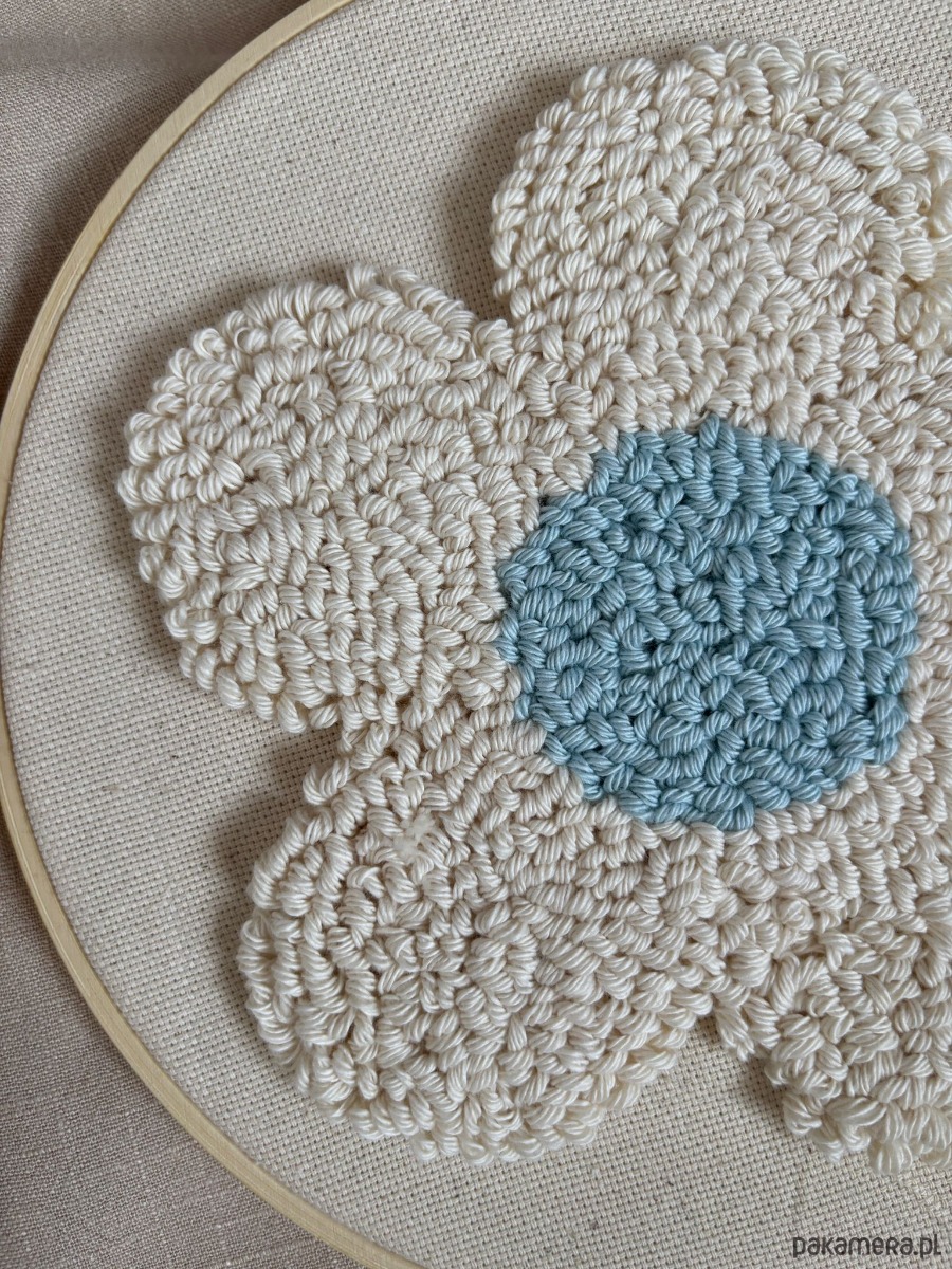 Delikatny obraz wykonany ręcznie techniką punch needle – malowany włóczką, ścieg po ściegu.