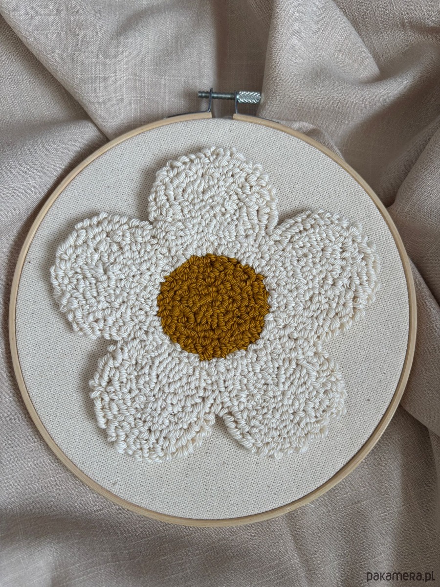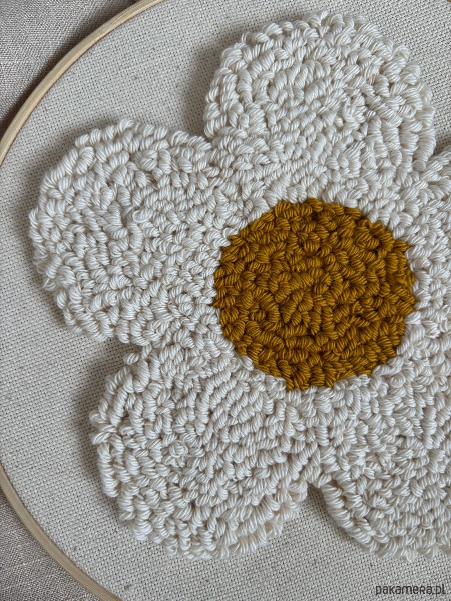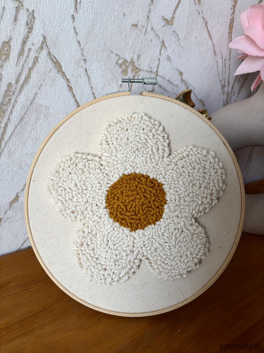 Delikatny obraz wykonany ręcznie techniką punch needle – malowany włóczką, ścieg po ściegu.