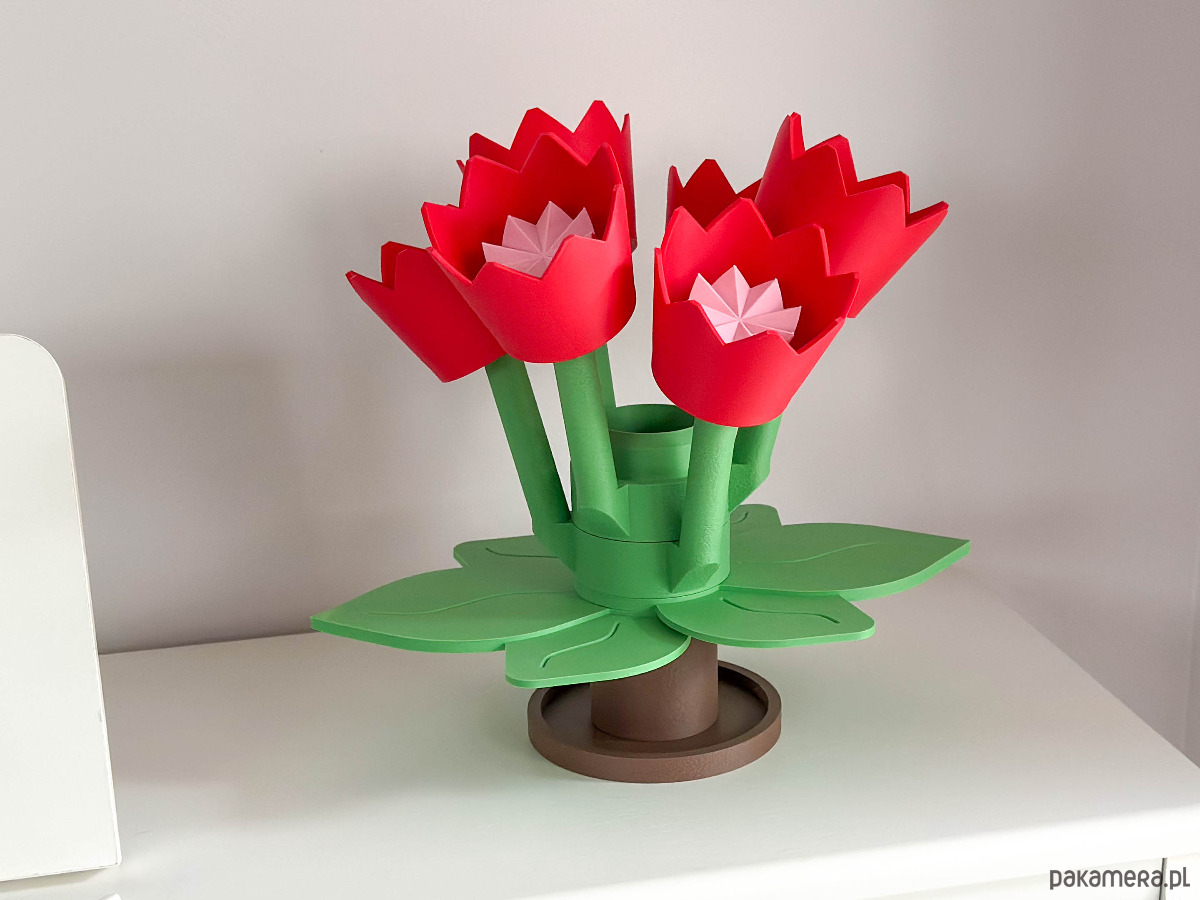 "Kwiatek z klocków z podstawką to uroczy i praktyczny element dekoracyjny, który łączy dekorację z funkcjonalnością. Wykonany w formie składanego kwiatka przypominającego budowę klocków, stanowi ciekawy element wystroju biurka lub pokoju. Podstawka pełni rolę pojemniczka – idealna do przechowywania drobnych przedmiotów, takich jak spinacze, pierścionki, śrubki czy inne małe akcesoria.