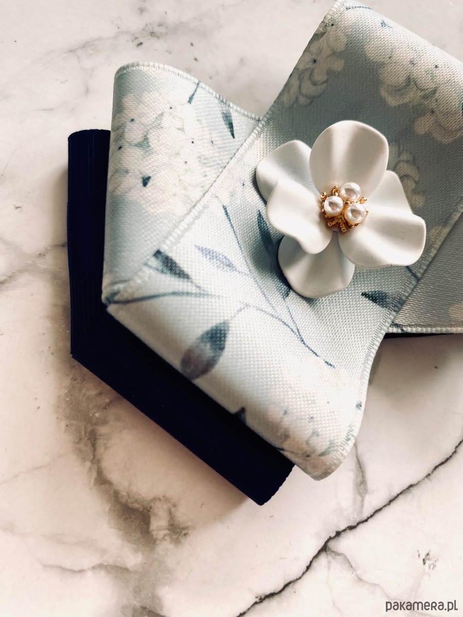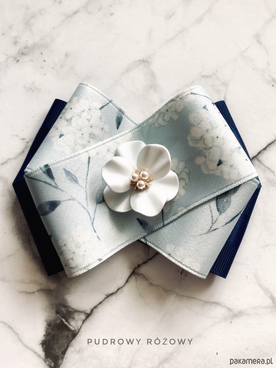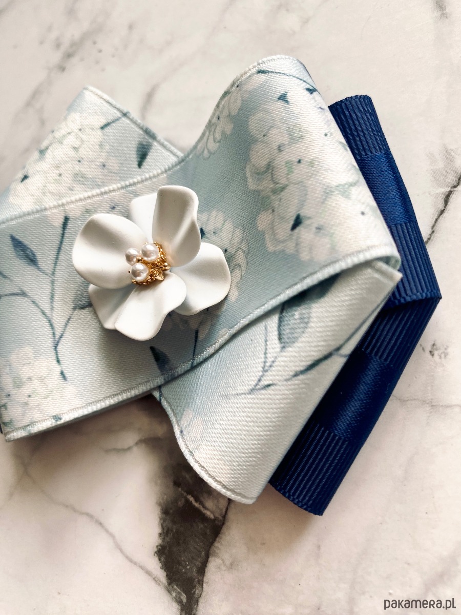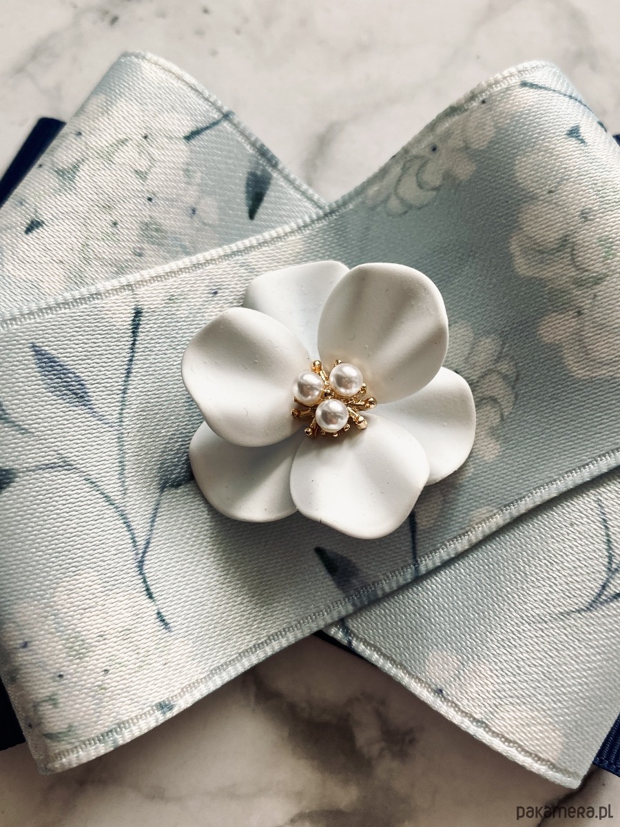 Piękna dekoracyjna ozdoba na środku, delikatny kwiat 3d w kolorze złamanej bieli z dodatkiem ślicznych perełek.