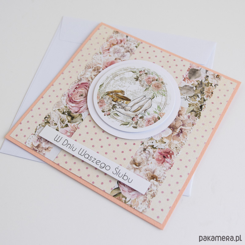 Ręcznie robiona kartka ślubna z kwiatowym motywem i napisem "W dniu Waszego ślubu"