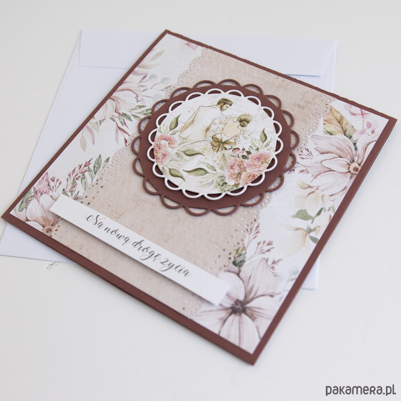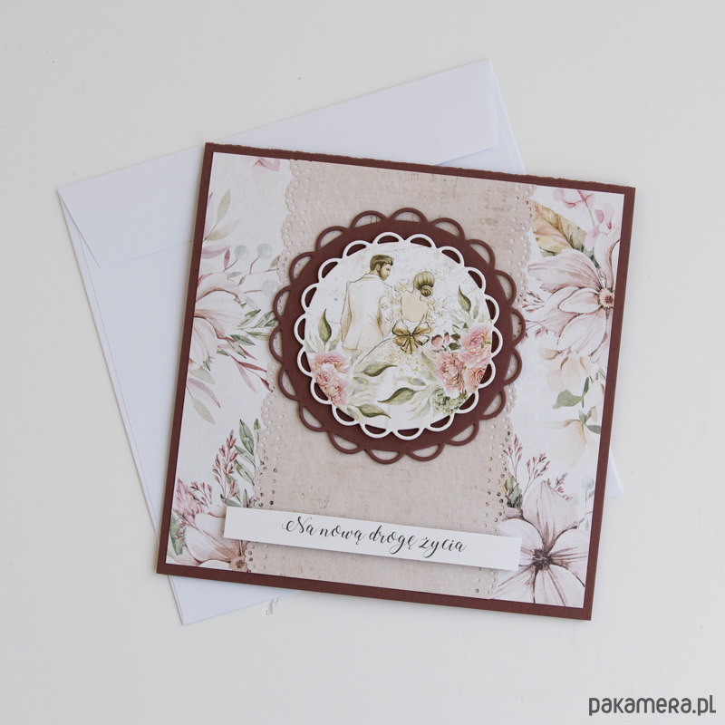 Ręcznie robiona kartka ślubna z kwiatowym motywem i napisem "Na nową drogę życia"