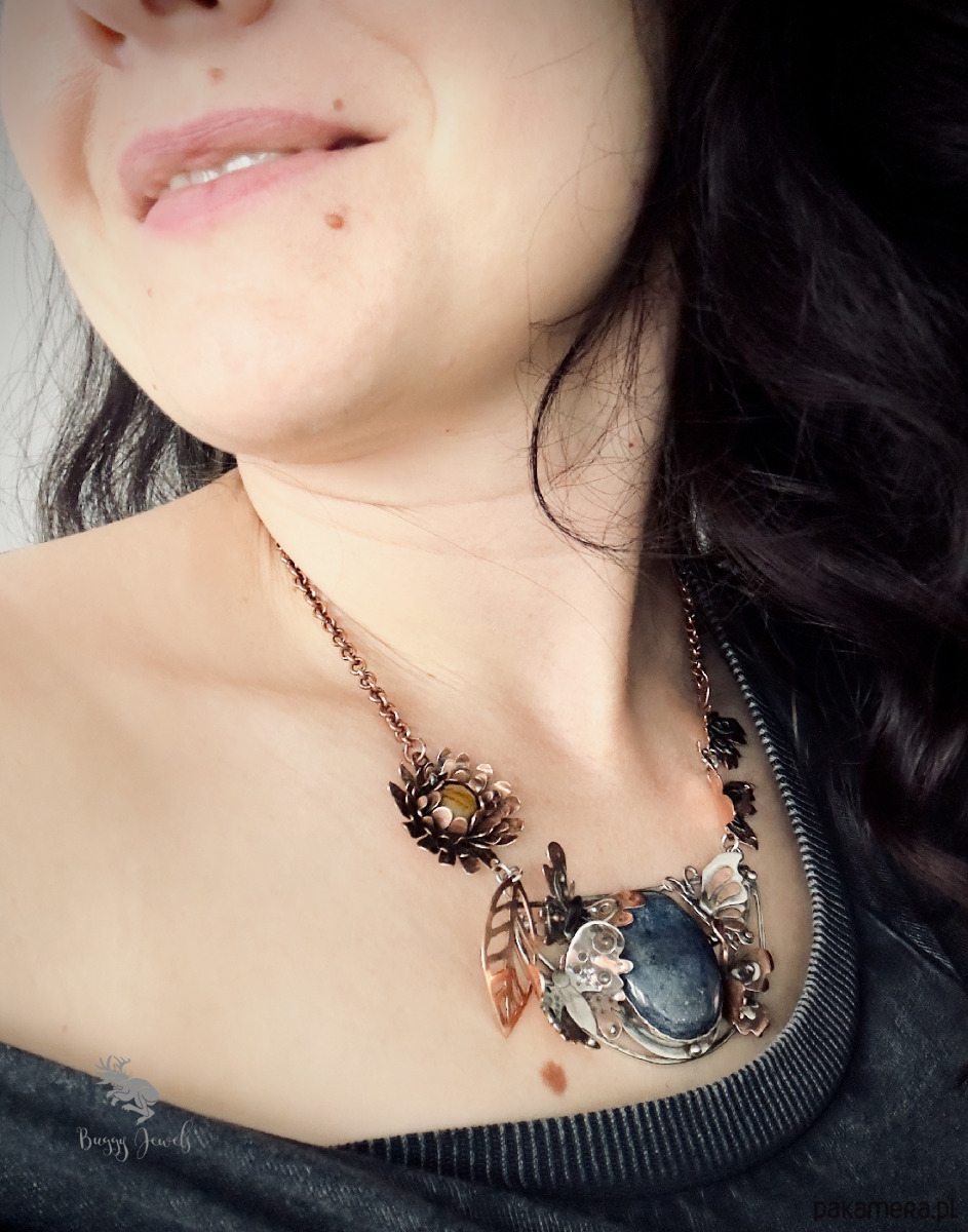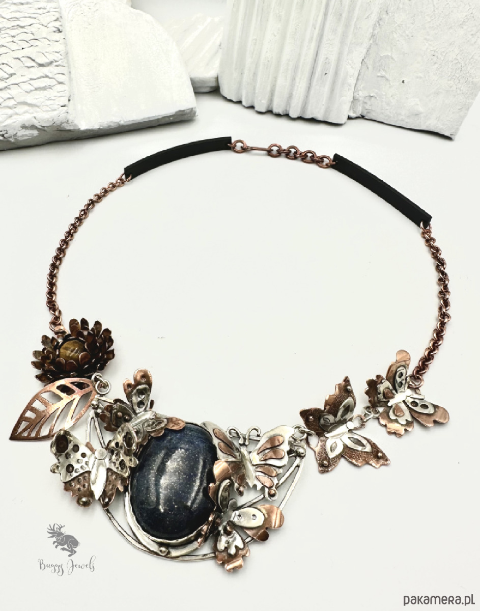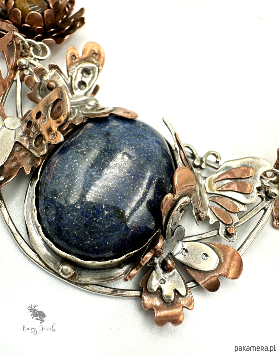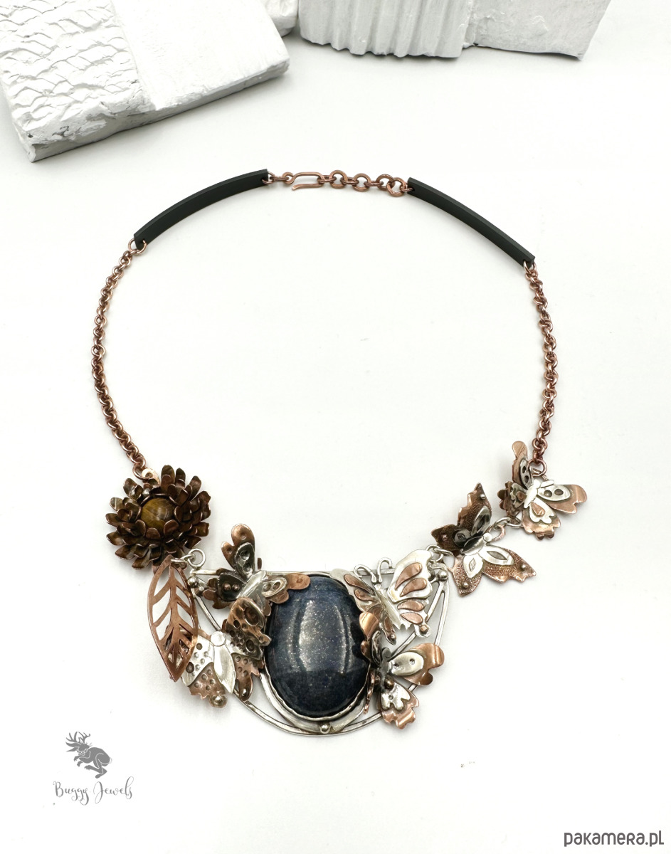 Kolia kwiatowa wykonana całkowicie ręcznie jest odpowiedzią na tęsknotę za prawdziwą, ciepłą wiosnę. Niebanalny i oryginalny naszyjnik z miedzianymi kwiatami i motylami otula niebieskość naturalnego kamienia lapis lazuli.