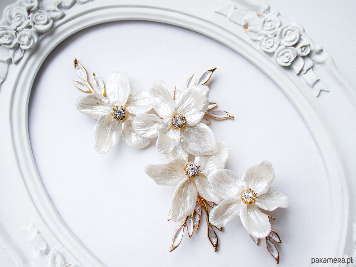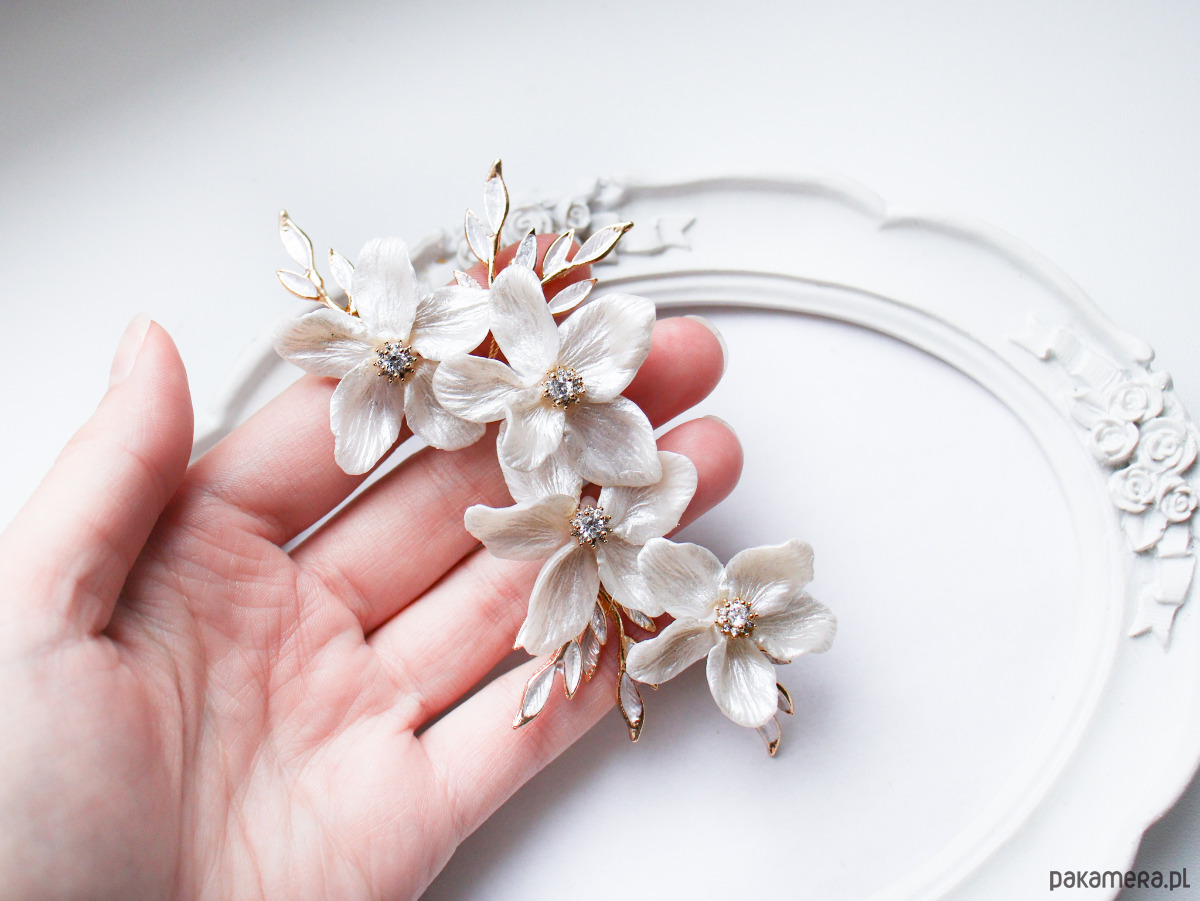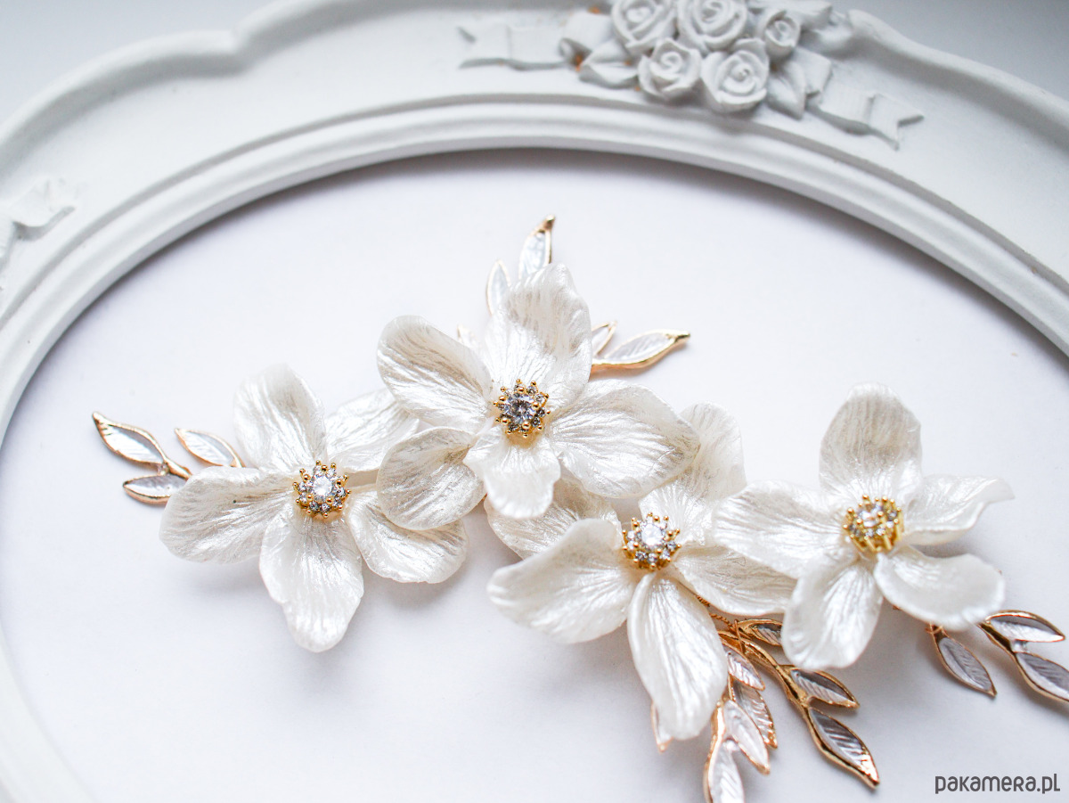 Ta ślubna winorośl to elegancka, ręcznie wykonana ozdoba do włosów, w której delikatne perłowe kwiaty łączą się ze złotymi akcentami, tworząc kompozycję o wyjątkowym, biżuteryjnym charakterze. Każdy płatek został uformowany ręcznie ze specjalistycznej masy plastycznej o subtelnym perłowym połysku, który pięknie odbija światło i nadaje całości luksusowego blasku. Złote listki i błyszczące, kryształowe środki kwiatów wprowadzają aurę wyrafinowania i sprawiają, że winorośl prezentuje się jak element ekskluzywnej ślubnej biżuterii.