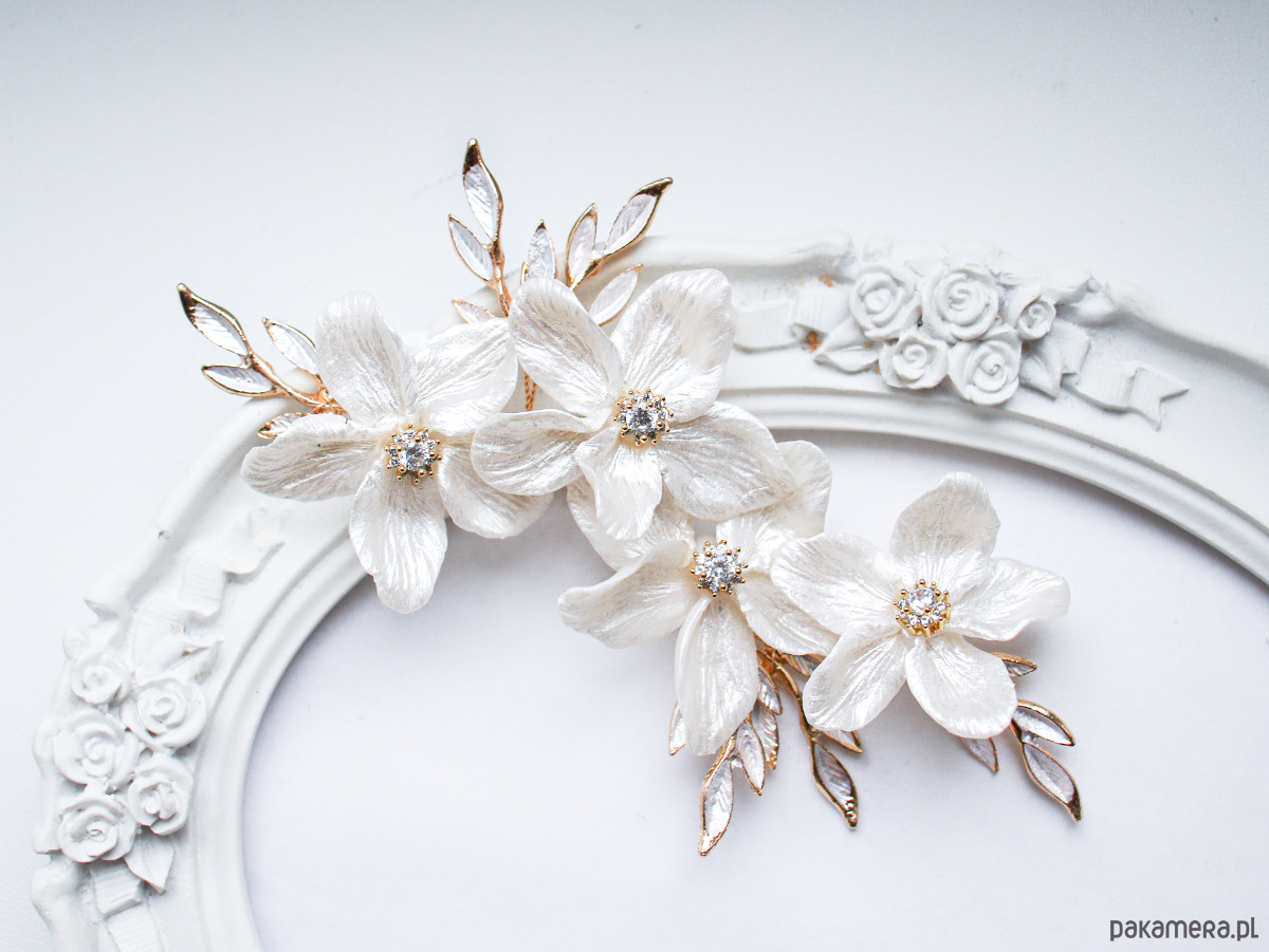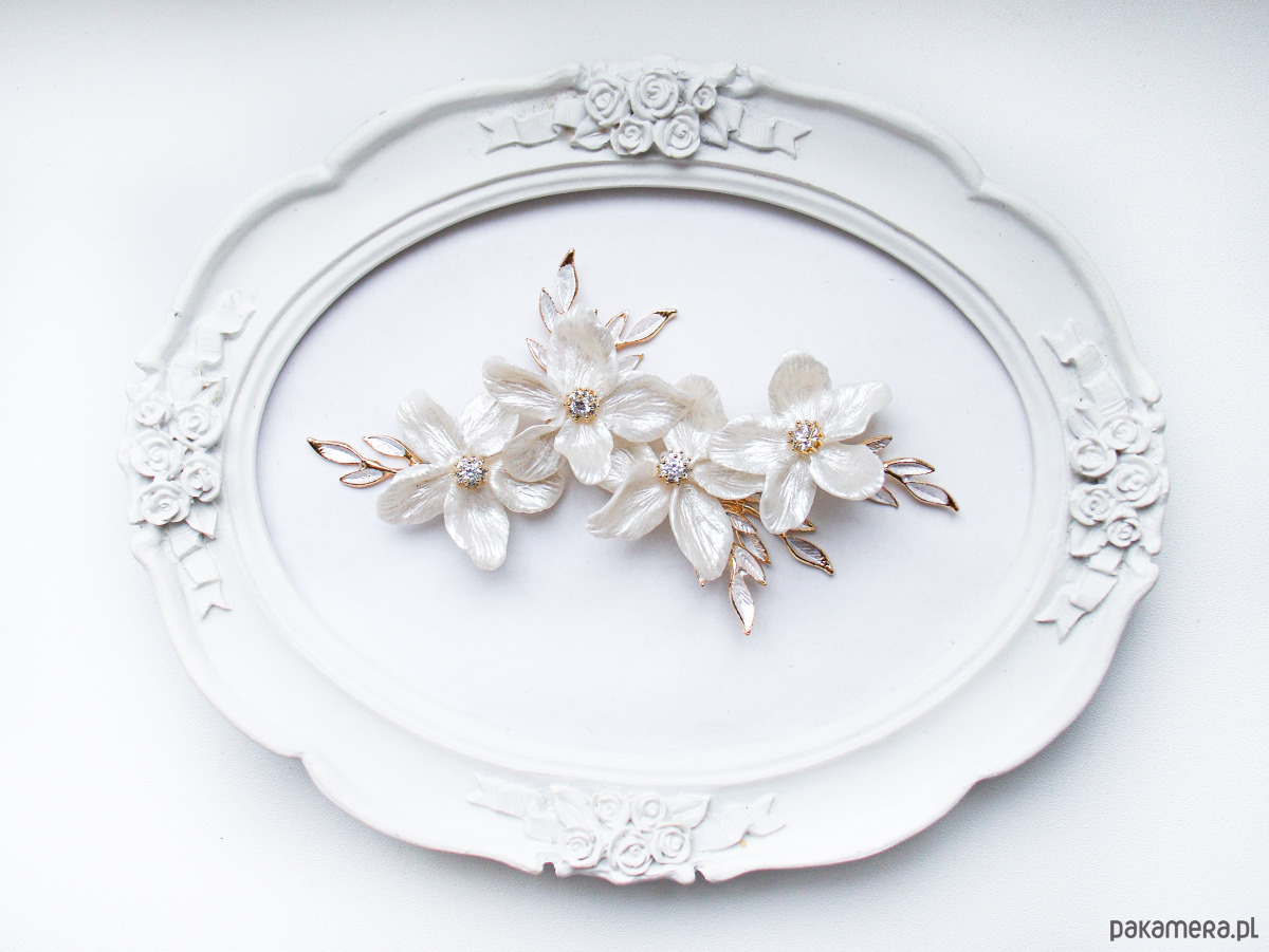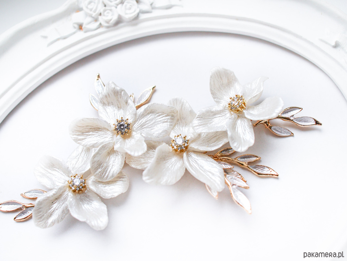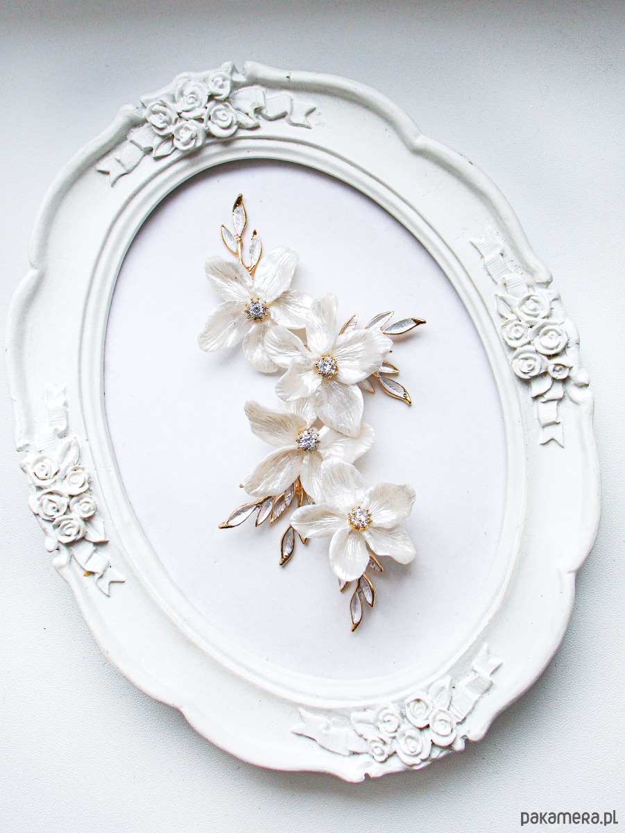 Ta ślubna winorośl to elegancka, ręcznie wykonana ozdoba do włosów, w której delikatne perłowe kwiaty łączą się ze złotymi akcentami, tworząc kompozycję o wyjątkowym, biżuteryjnym charakterze. Każdy płatek został uformowany ręcznie ze specjalistycznej masy plastycznej o subtelnym perłowym połysku, który pięknie odbija światło i nadaje całości luksusowego blasku. Złote listki i błyszczące, kryształowe środki kwiatów wprowadzają aurę wyrafinowania i sprawiają, że winorośl prezentuje się jak element ekskluzywnej ślubnej biżuterii.