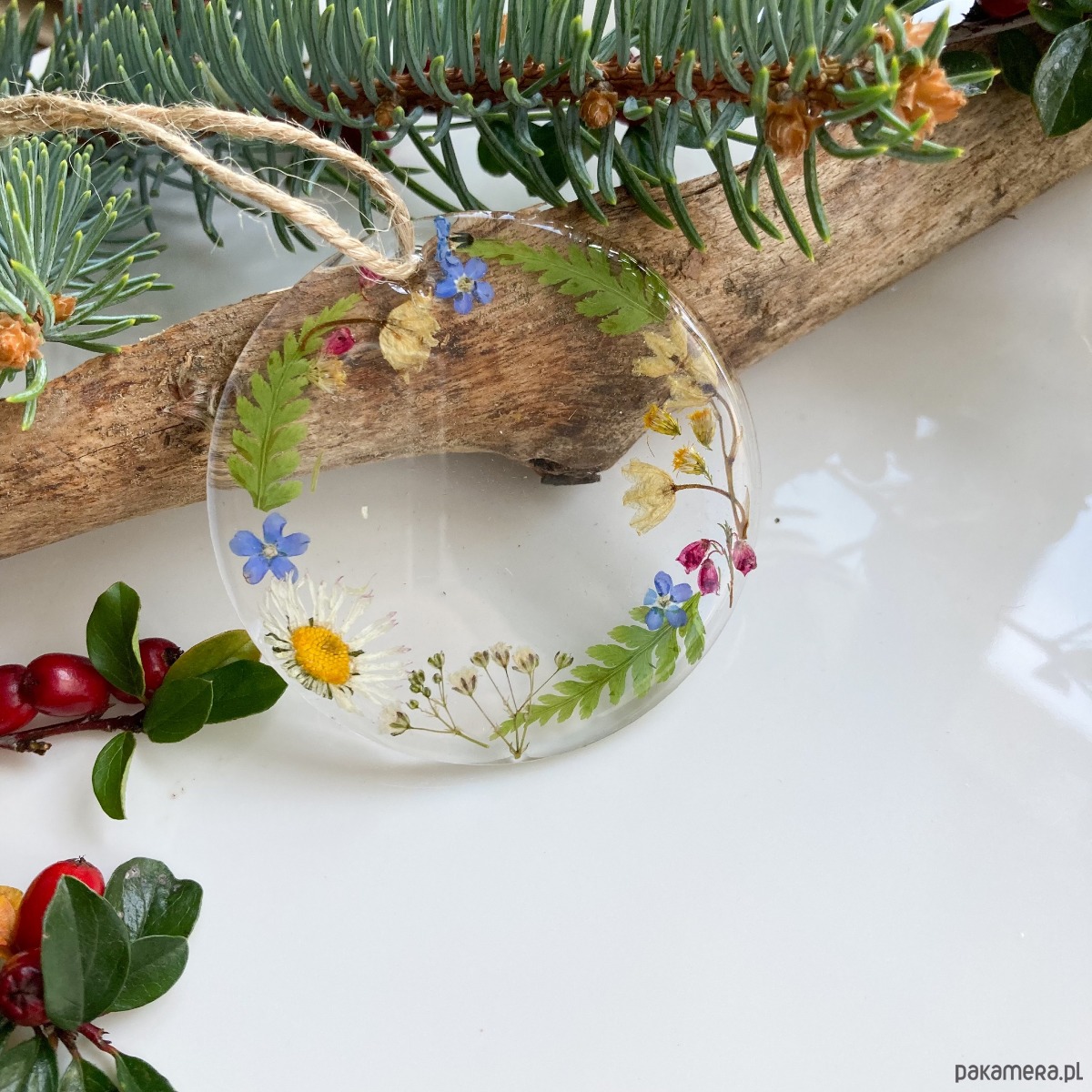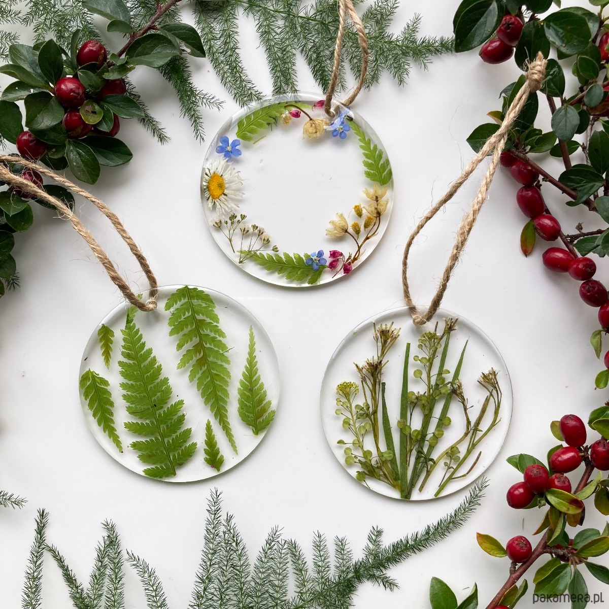 Niepowtarzalne, ręcznie robione bombki z pokrytymi żywicą suszonymi kwiatami. Zestaw zawiera 3 sztuki bombek wykonanych z pleksi (zatem nie da się ich stłuc). To świetny pomysł na niebanalny, wyjątkowy prezent- na życzenie klienta mogę dołączyć karteczkę z dedykacją.