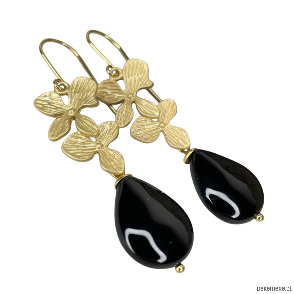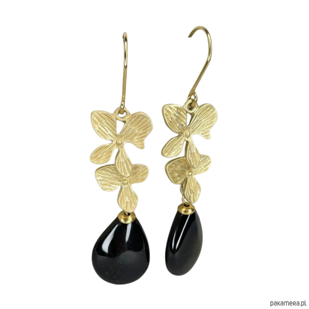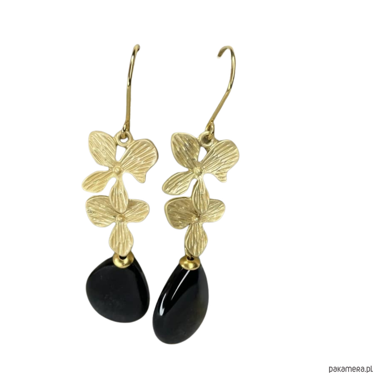 Kwiatowe kolczyki pozłacane z kroplą onyksu