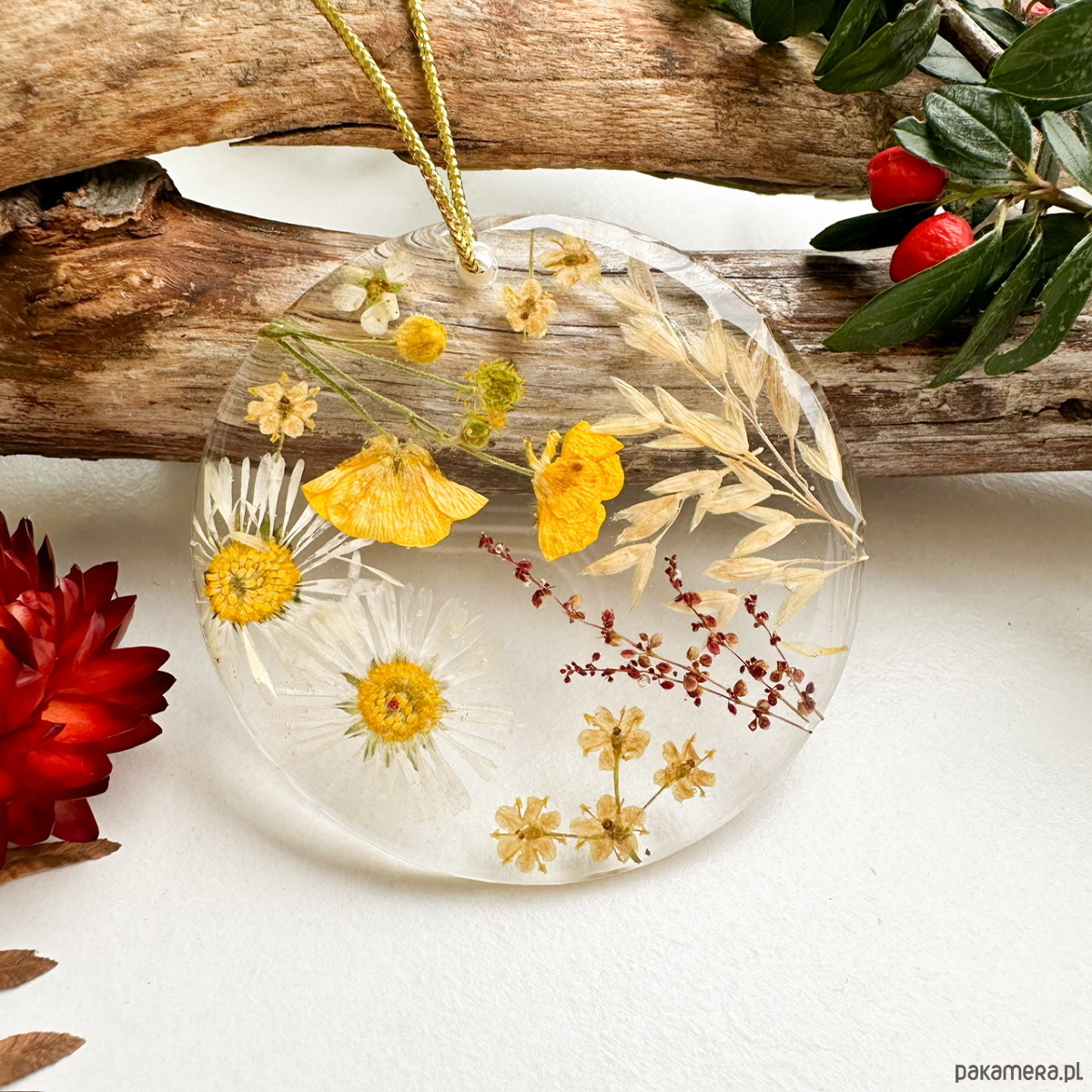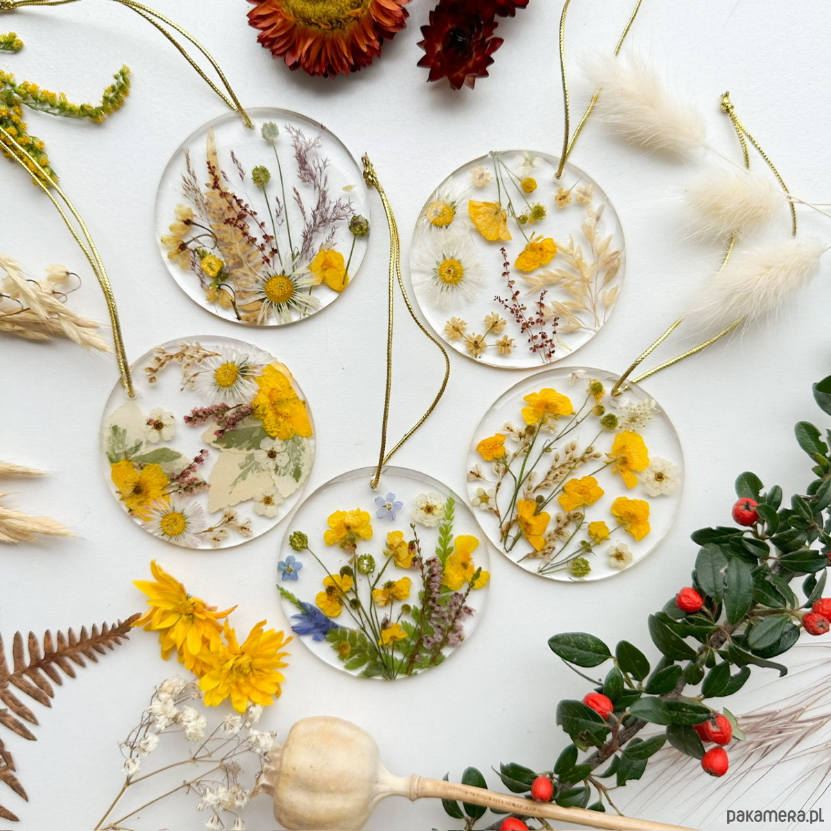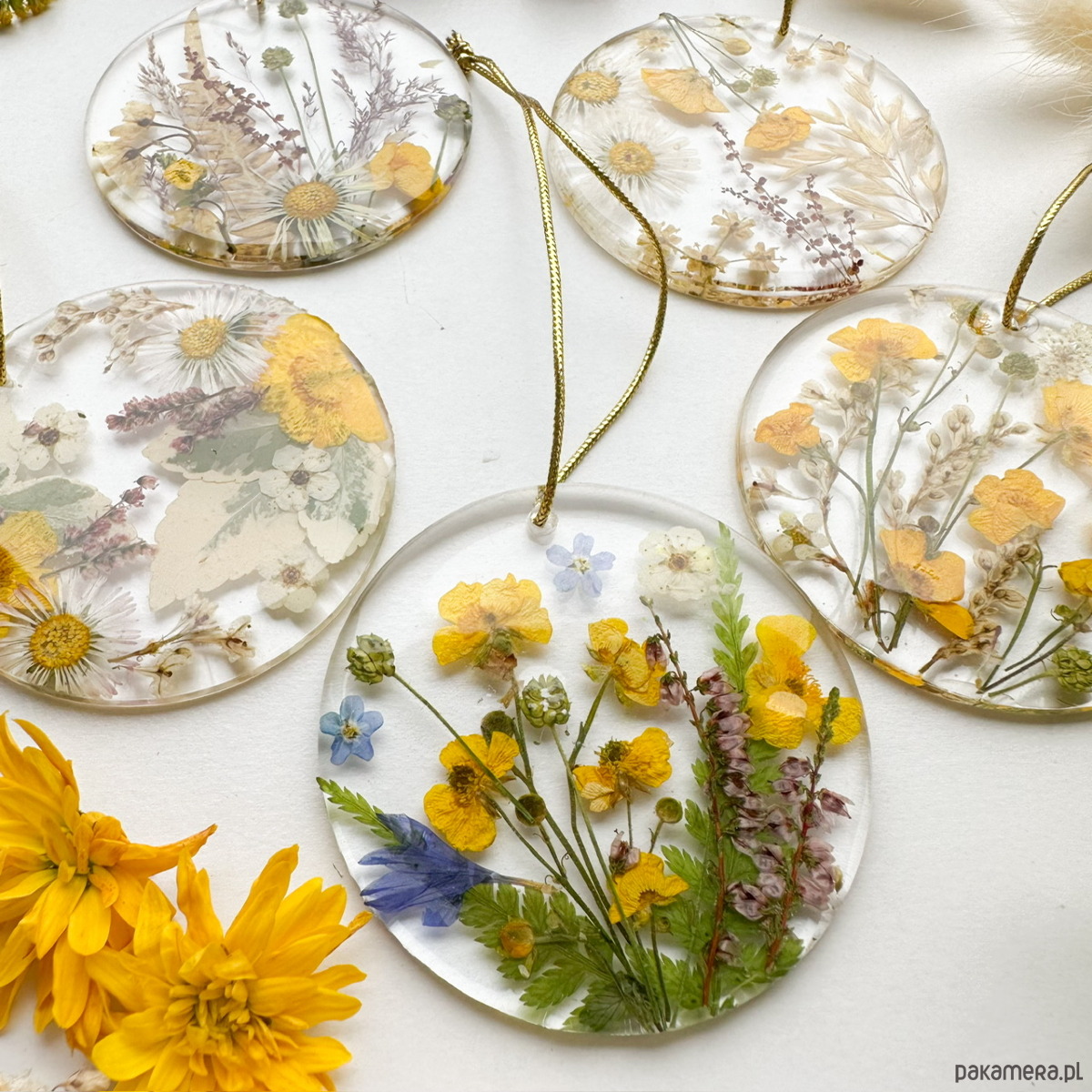 Niepowtarzalne, ręcznie robione bombki z pokrytymi żywicą suszonymi kwiatami. Zestaw zawiera 5 sztuk bombek wykonanych z pleksi (zatem nie da się ich stłuc). To świetny pomysł na niebanalny, wyjątkowy prezent- na życzenie klienta mogę dołączyć karteczkę z dedykacją.