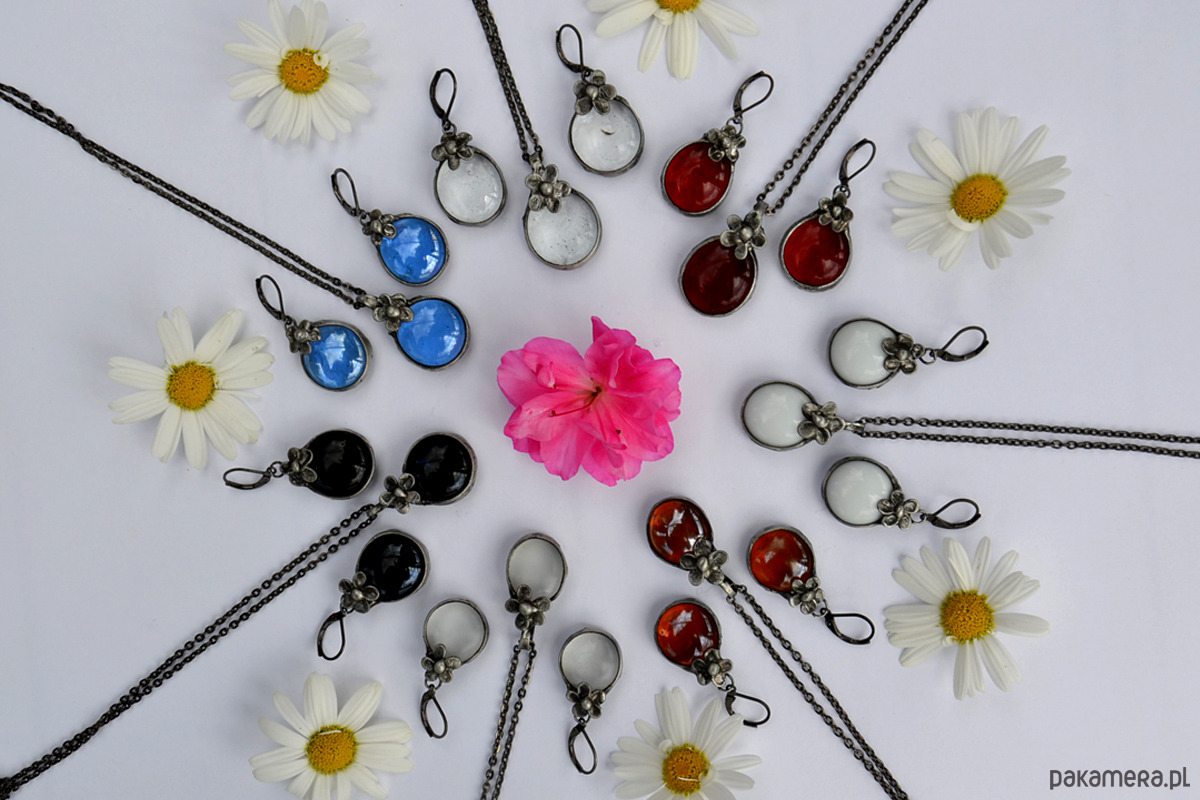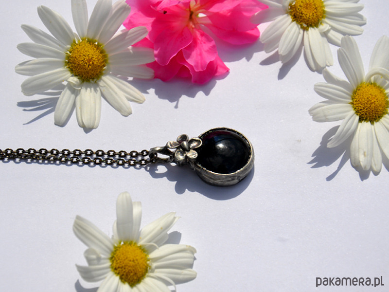 Niepowtarzalny, romantyczny naszyjnik z czarnym szkłem. Wymiary wisiorka to ok 3 x 1,5 cm. Oprawa i łańcuszek o długości 45 cm w kolorze starego srebra. Biżuteria w 100% wykonana ręcznie, więc poszczególne egzemplarze mogą nieznacznie się między sobą różnić.