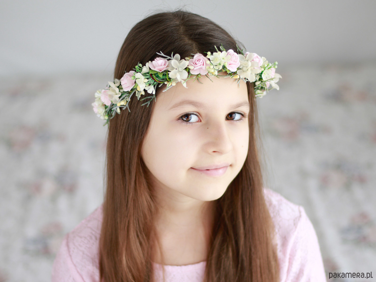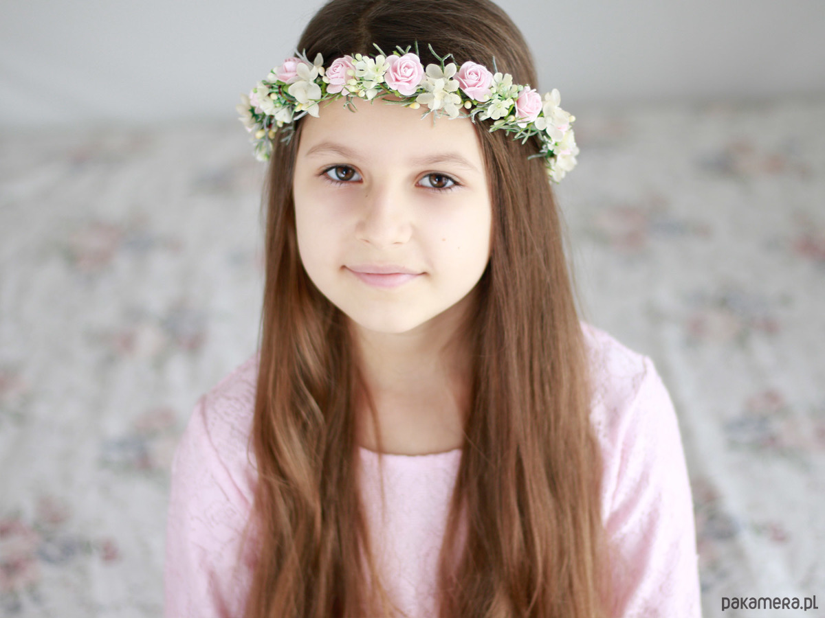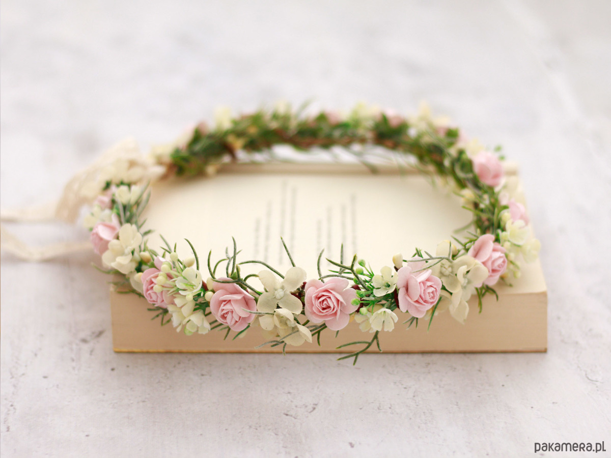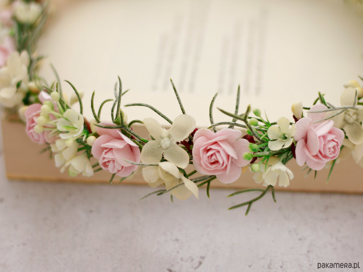 Romantyczny wianek na głowę, zdobiony kwiatami w odcieniach różu i ecru. Możliwość regulacji wielkości obwodu, dzięki koronkowej tasiemce z tyłu. Będzie pasował zarówno na głowę dziecka, jak i osoby dorosłej. Ozdoba będzie idealna na Pierwszą Komunię Świętą. Wianek wykonany ręcznie, z najwyższą starannością, w pracowni "Lola White" w Polsce.
