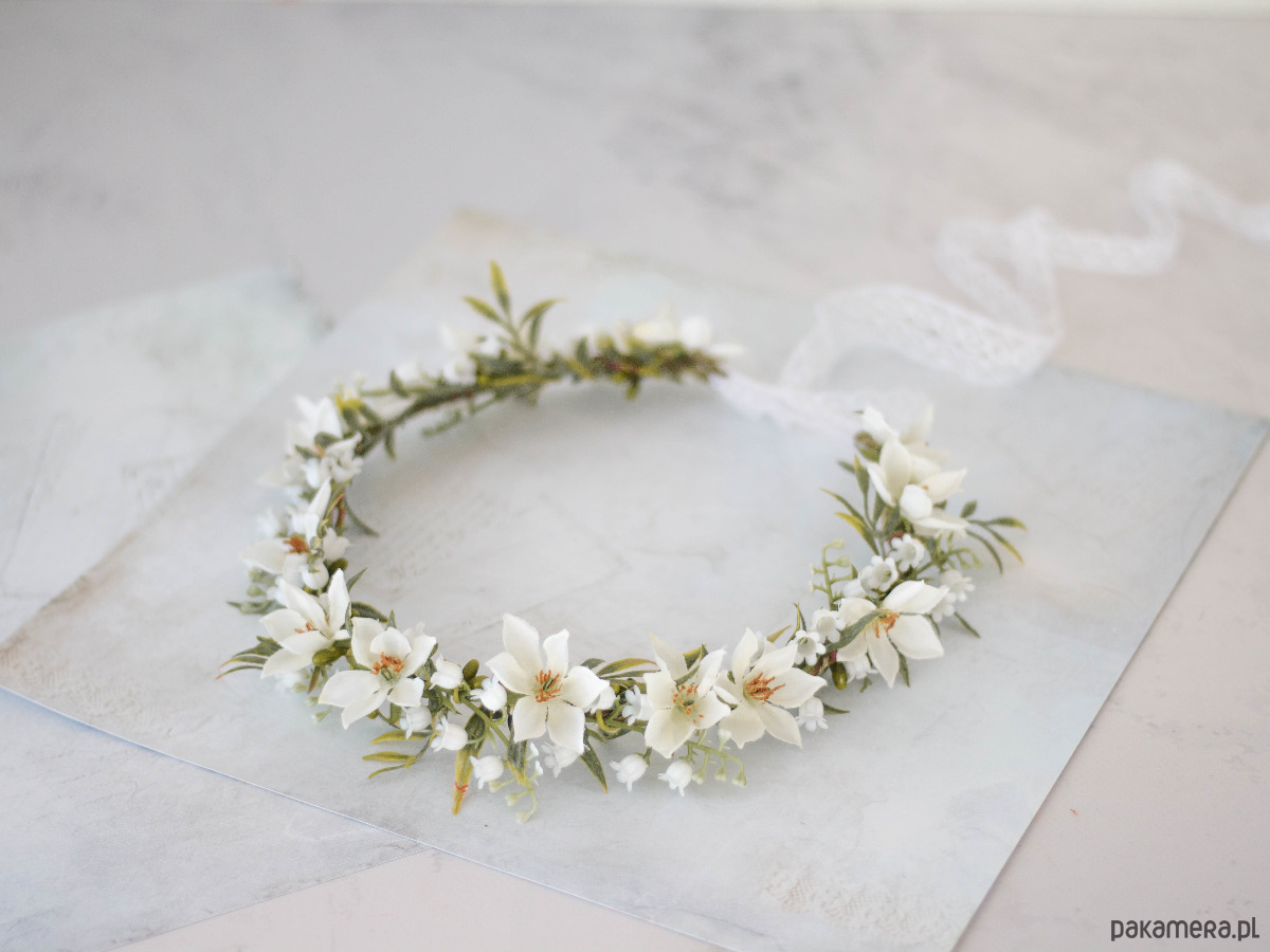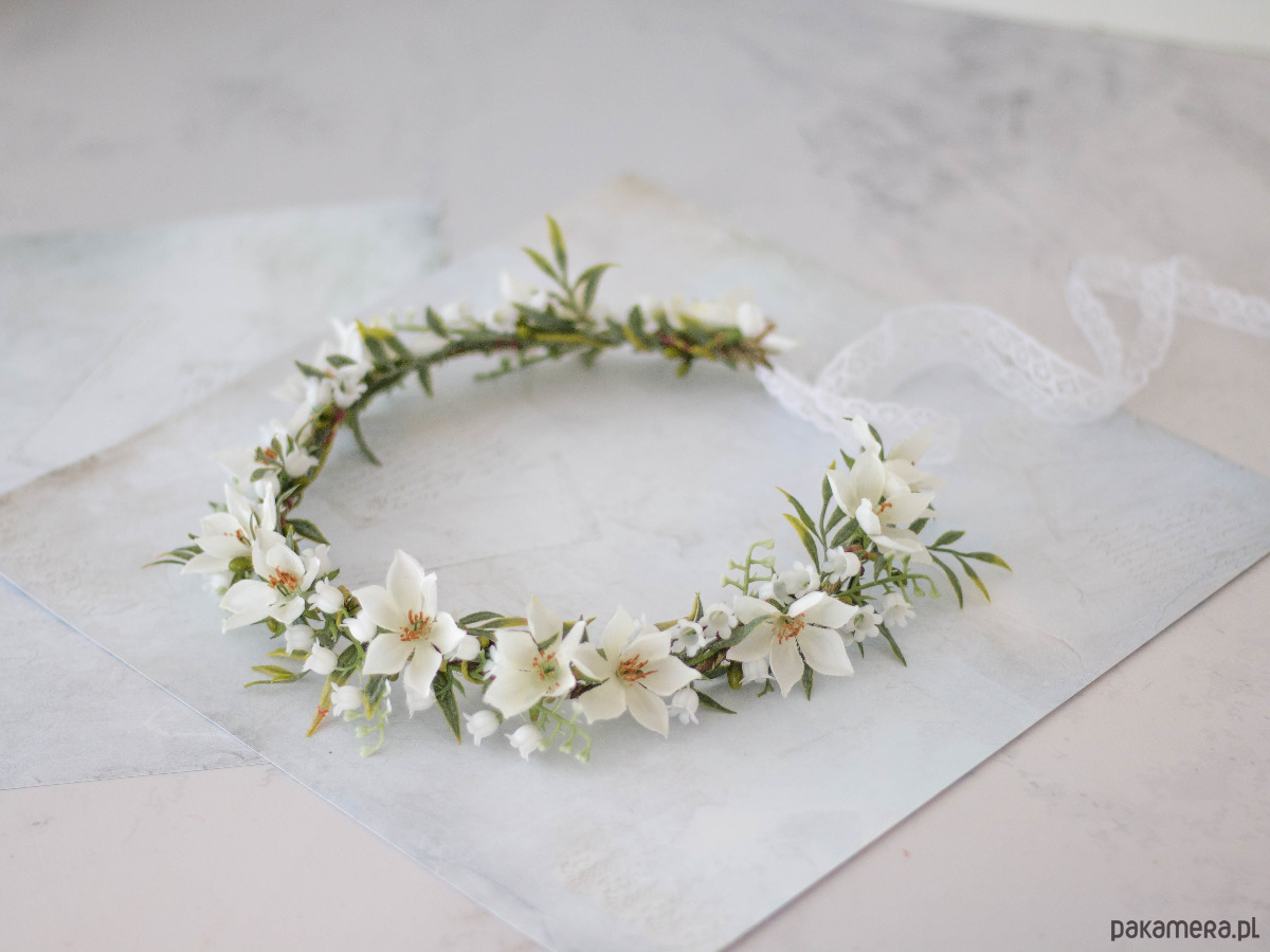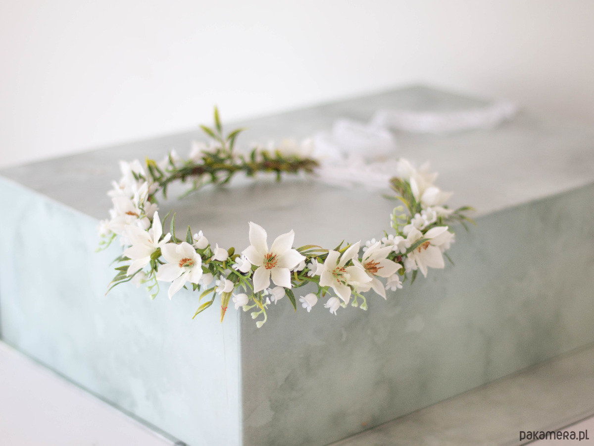 Romantyczny wianek na głowę, zdobiony kwiatami z tkaniny oraz syntetycznymi konwaliami i listkami. Możliwość regulacji wielkości obwodu, dzięki koronkowej tasiemce z tyłu. Będzie pasował zarówno na głowę dziecka, jak i osoby dorosłej. Ozdoba będzie idealna na Pierwszą Komunię Świętą. Wianek wykonany ręcznie, z najwyższą starannością, w pracowni "Lola White" w Polsce.