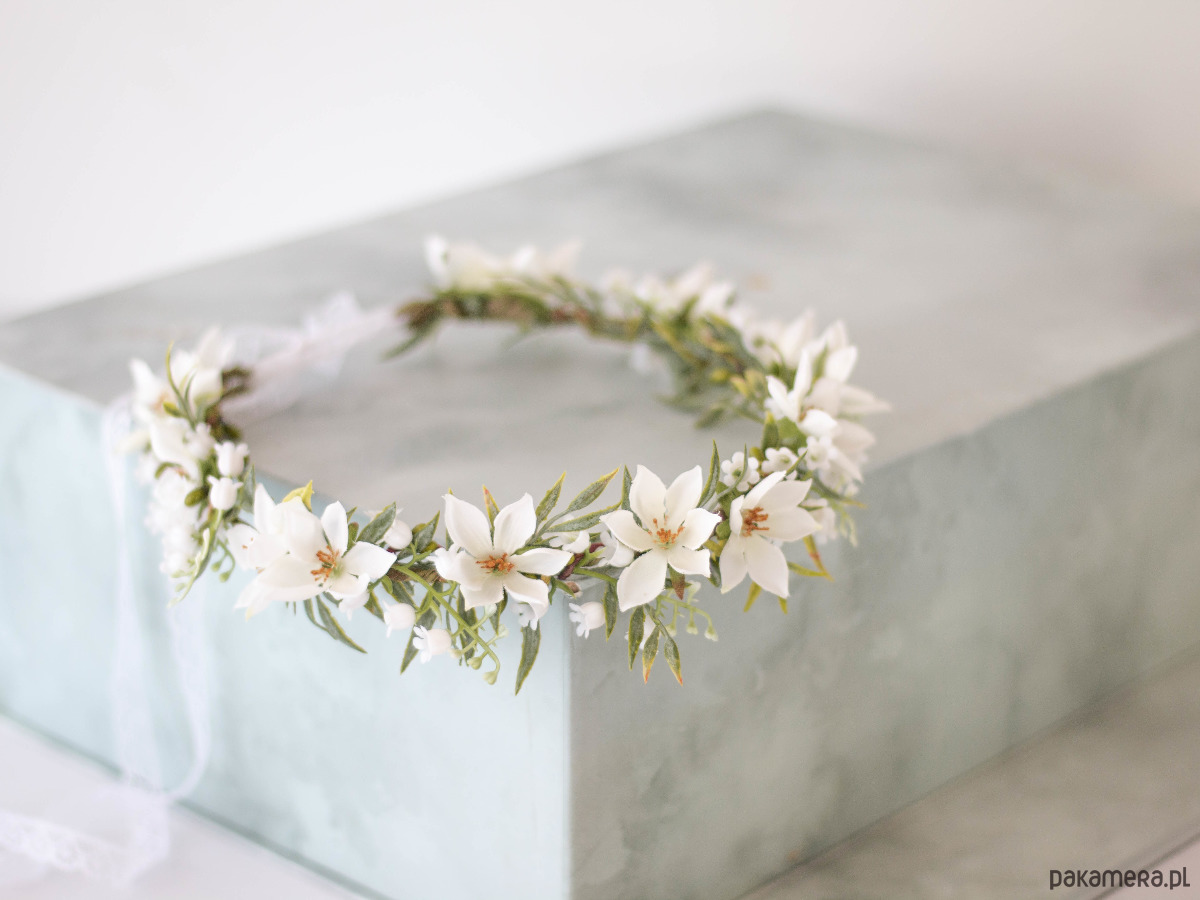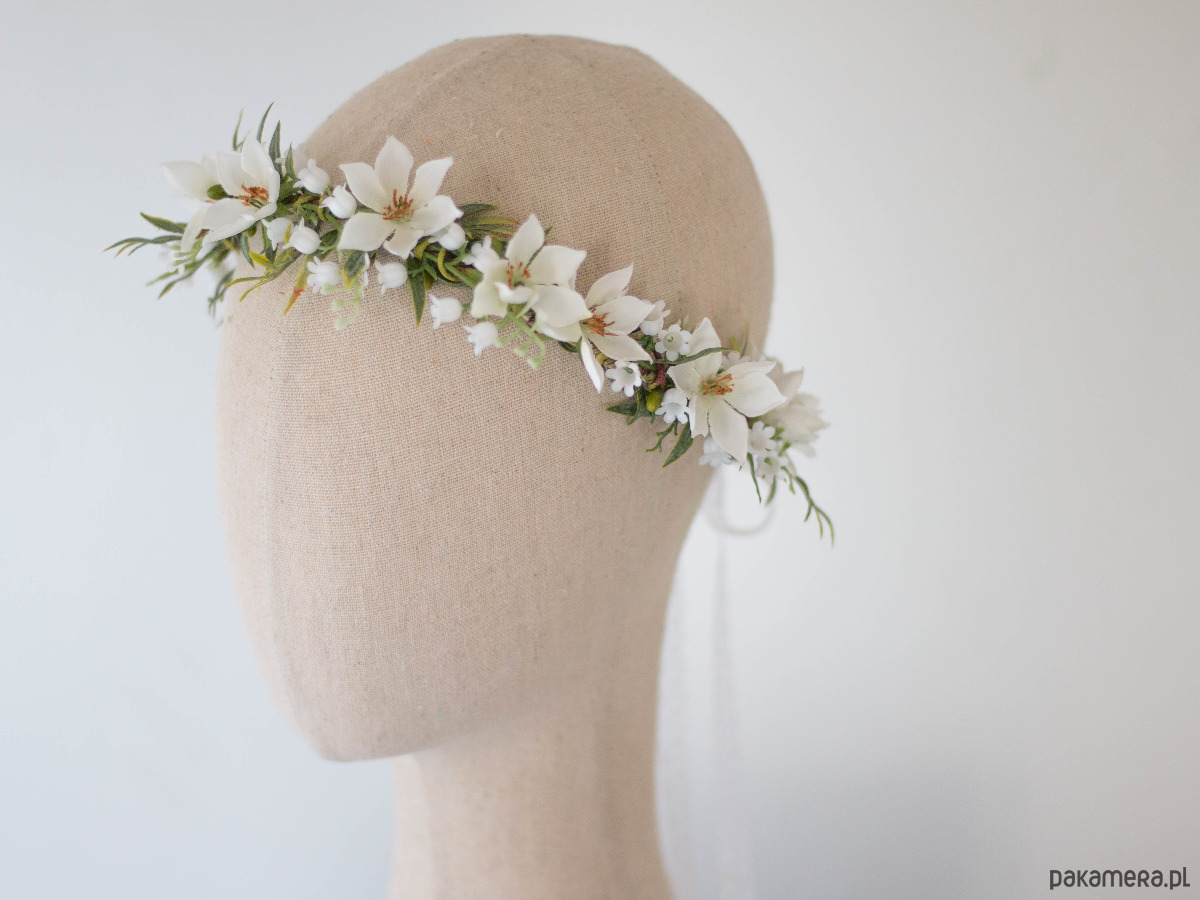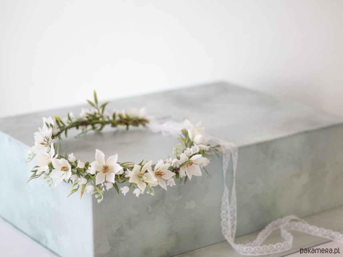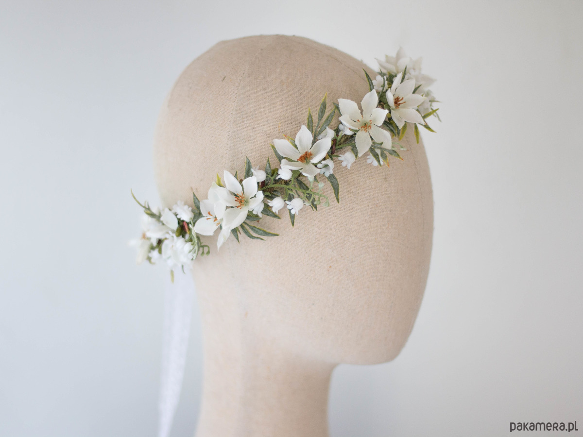 Romantyczny wianek na głowę, zdobiony kwiatami z tkaniny oraz syntetycznymi konwaliami i listkami. Możliwość regulacji wielkości obwodu, dzięki koronkowej tasiemce z tyłu. Będzie pasował zarówno na głowę dziecka, jak i osoby dorosłej. Ozdoba będzie idealna na Pierwszą Komunię Świętą. Wianek wykonany ręcznie, z najwyższą starannością, w pracowni "Lola White" w Polsce.