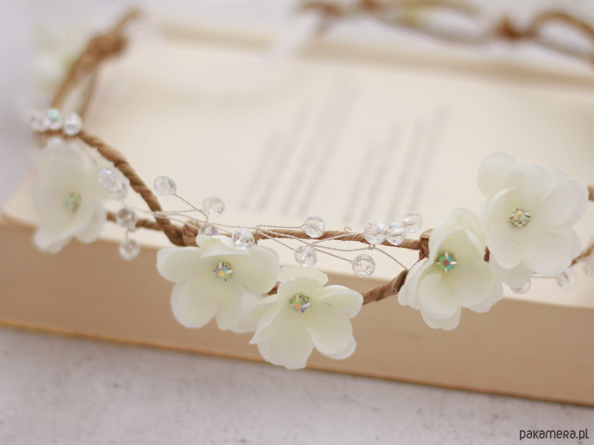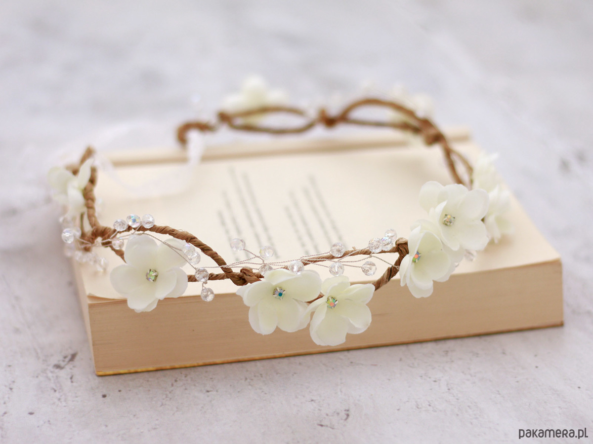 Romantyczny wianek na głowę, zdobiony materiałowymi kwiatami i kryształkami. Możliwość regulacji wielkości obwodu, dzięki koronkowej tasiemce z tyłu. Będzie pasował zarówno na głowę dziecka, jak i osoby dorosłej. Ozdoba będzie idealna na Pierwszą Komunię Świętą.