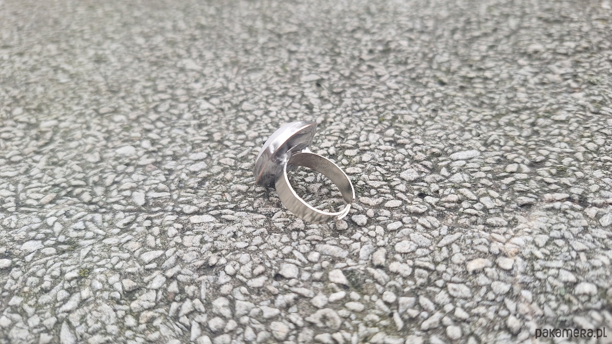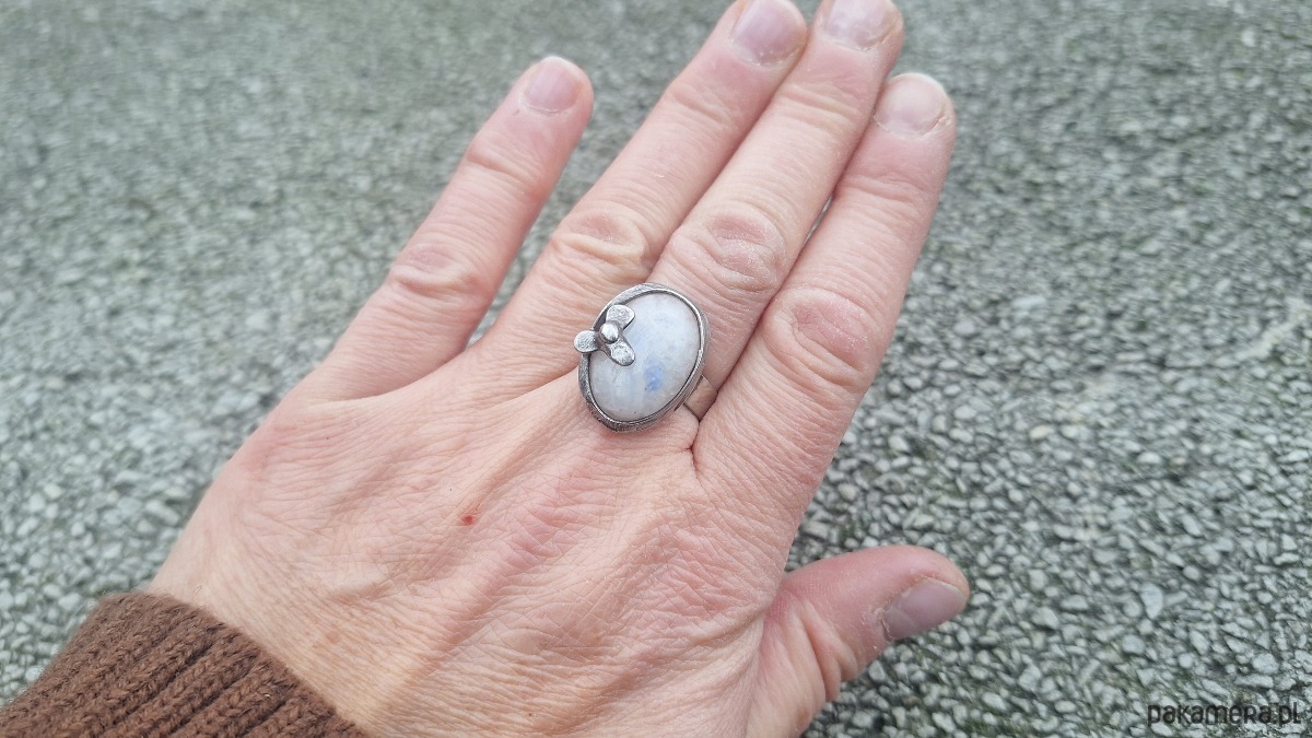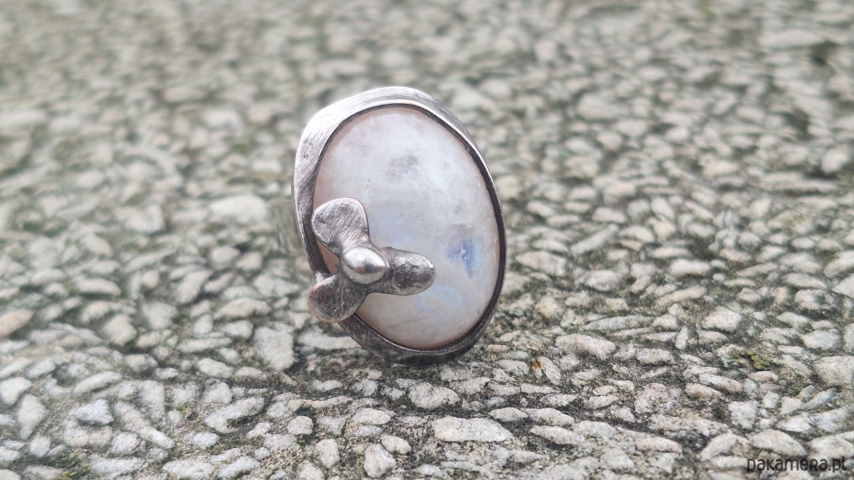 Pierścionek wykonany z miedzi, cyny i naturalnego kamienia księżycowego. Wymiary ok. 2 na 1.5 cm. Regulowany. Nie jest ciężki.