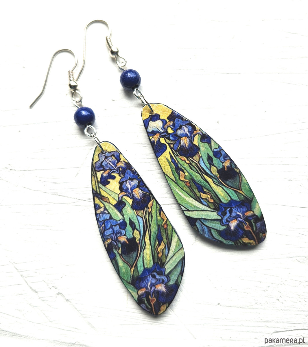 kolczyki drewniane, ozdobione metodą decoupage, dwustronne, starannie wykończone farbami akrylowymi i zabezpieczone wielokrotnie lakierem, bigle posrebrzane, długość kolczyków bez bigli: 6 cm, szerokość: 2 cm, bardzo lekkie