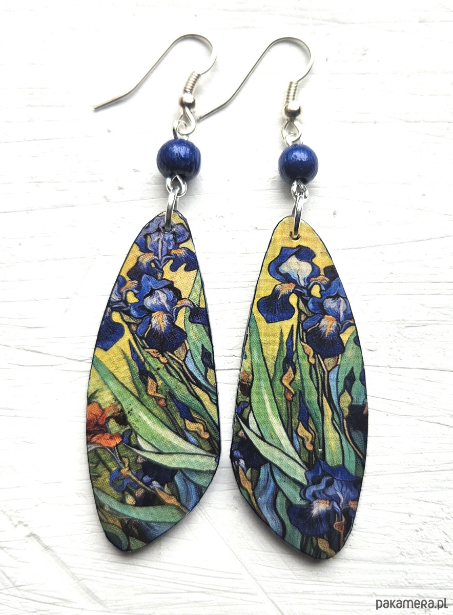 kolczyki drewniane, ozdobione metodą decoupage, dwustronne, starannie wykończone farbami akrylowymi i zabezpieczone wielokrotnie lakierem, bigle posrebrzane, długość kolczyków bez bigli: 6 cm, szerokość: 2 cm, bardzo lekkie