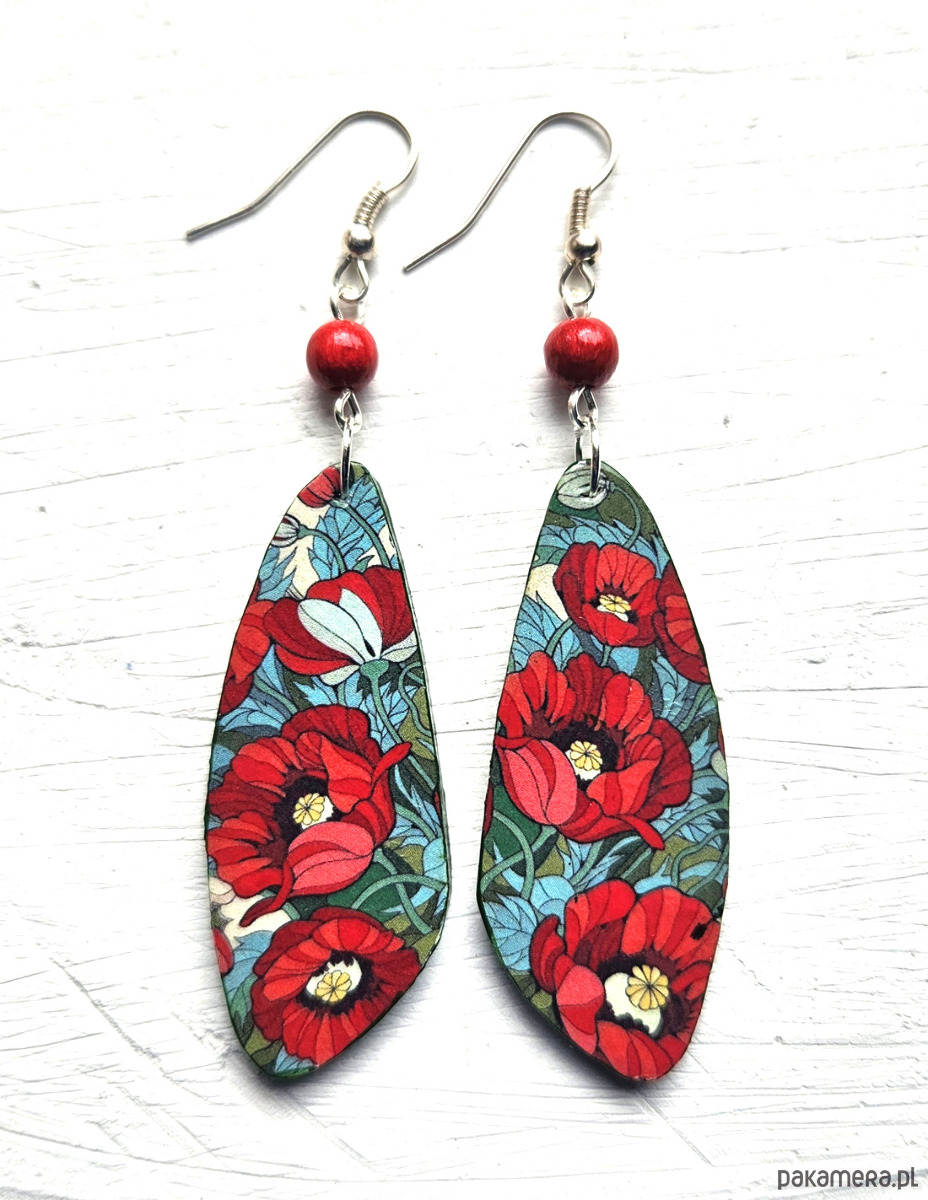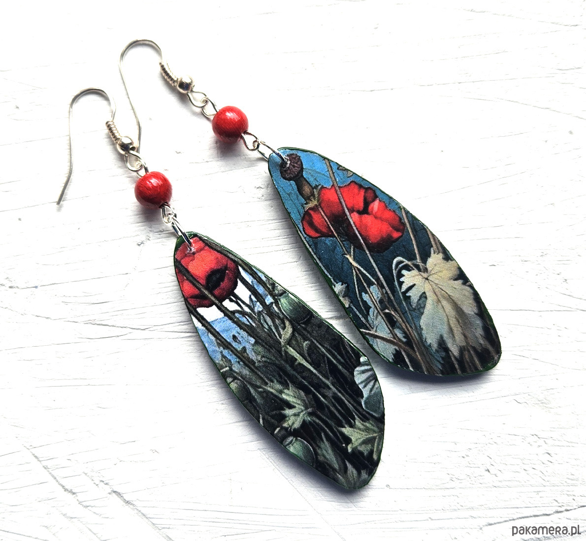 kolczyki drewniane, ozdobione metodą decoupage, dwustronne, starannie wykończone farbami akrylowymi i zabezpieczone wielokrotnie lakierem, bigle posrebrzane, długość kolczyków bez bigli: 6 cm, szerokość: 2 cm, bardzo lekkie