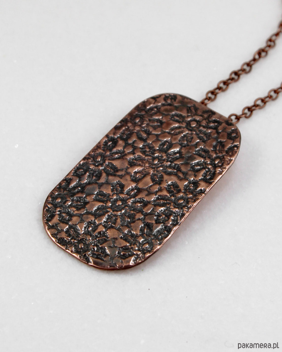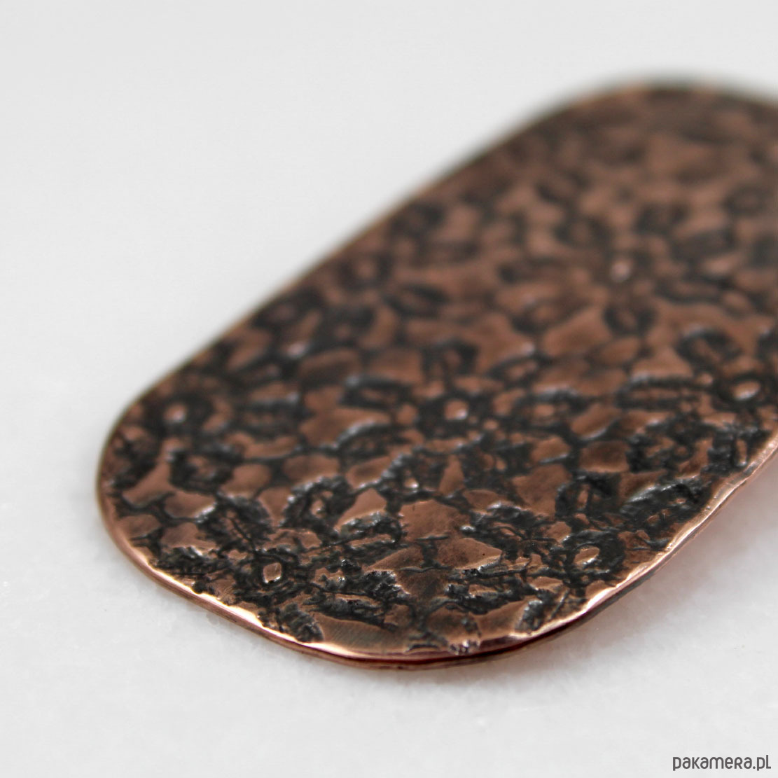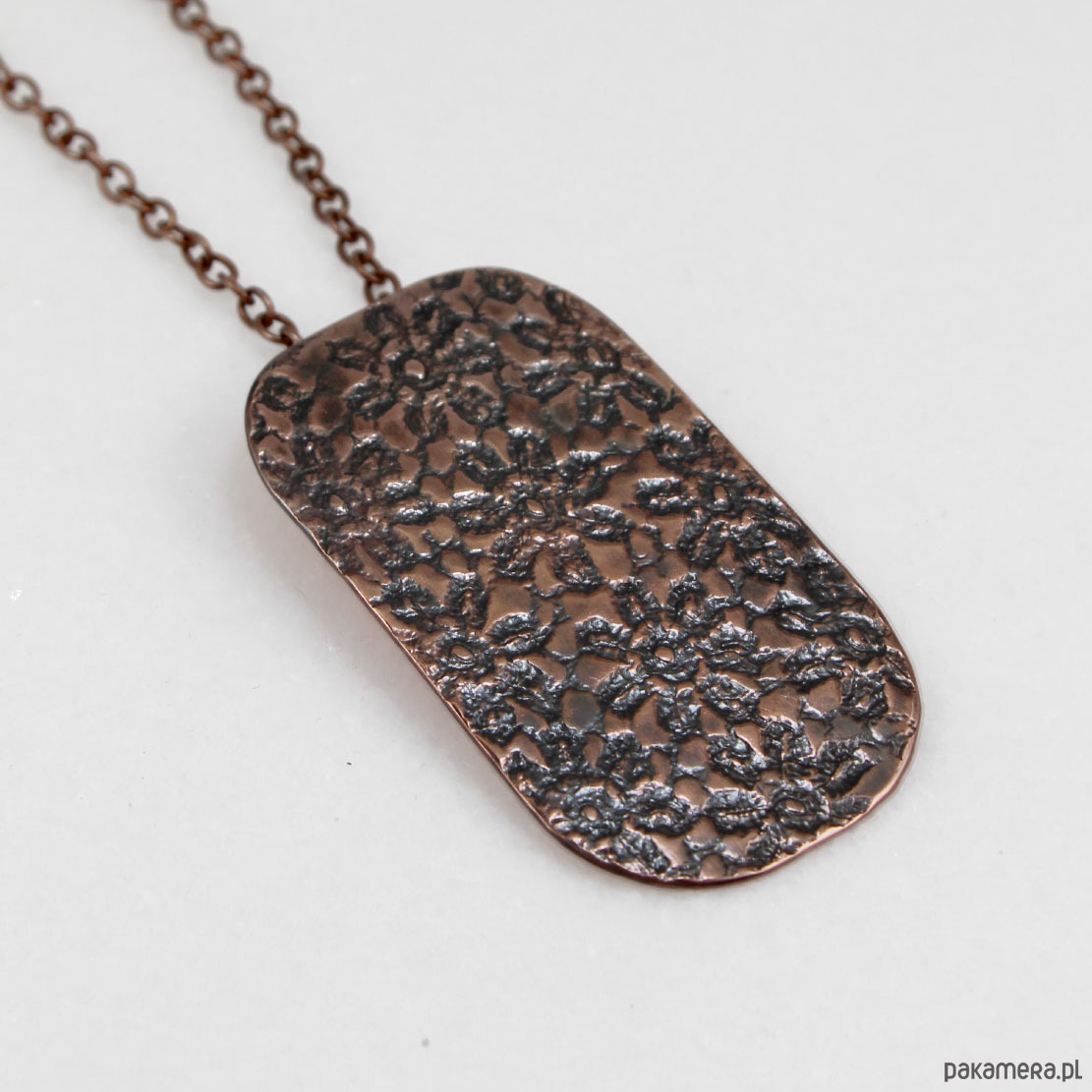 Wisior został wykonany ręcznie ze szlachetnej miedzi, ma nieregularną fakturę i jest lekko patynowany w procesie oksydacji (bez użycia sztucznych barwników). Całkowita długość wisiorka to ok 6 cm. W komplecie łańcuszek do zawieszenia.