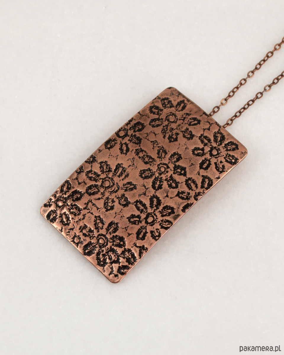 Wisior został wykonany ręcznie ze szlachetnej miedzi, ma nieregularną fakturę i jest lekko patynowany w procesie oksydacji (bez użycia sztucznych barwników). Całkowita długość wisiorka to ok 5.5 cm. W komplecie jest bawełniany sznurek do zawieszenia.