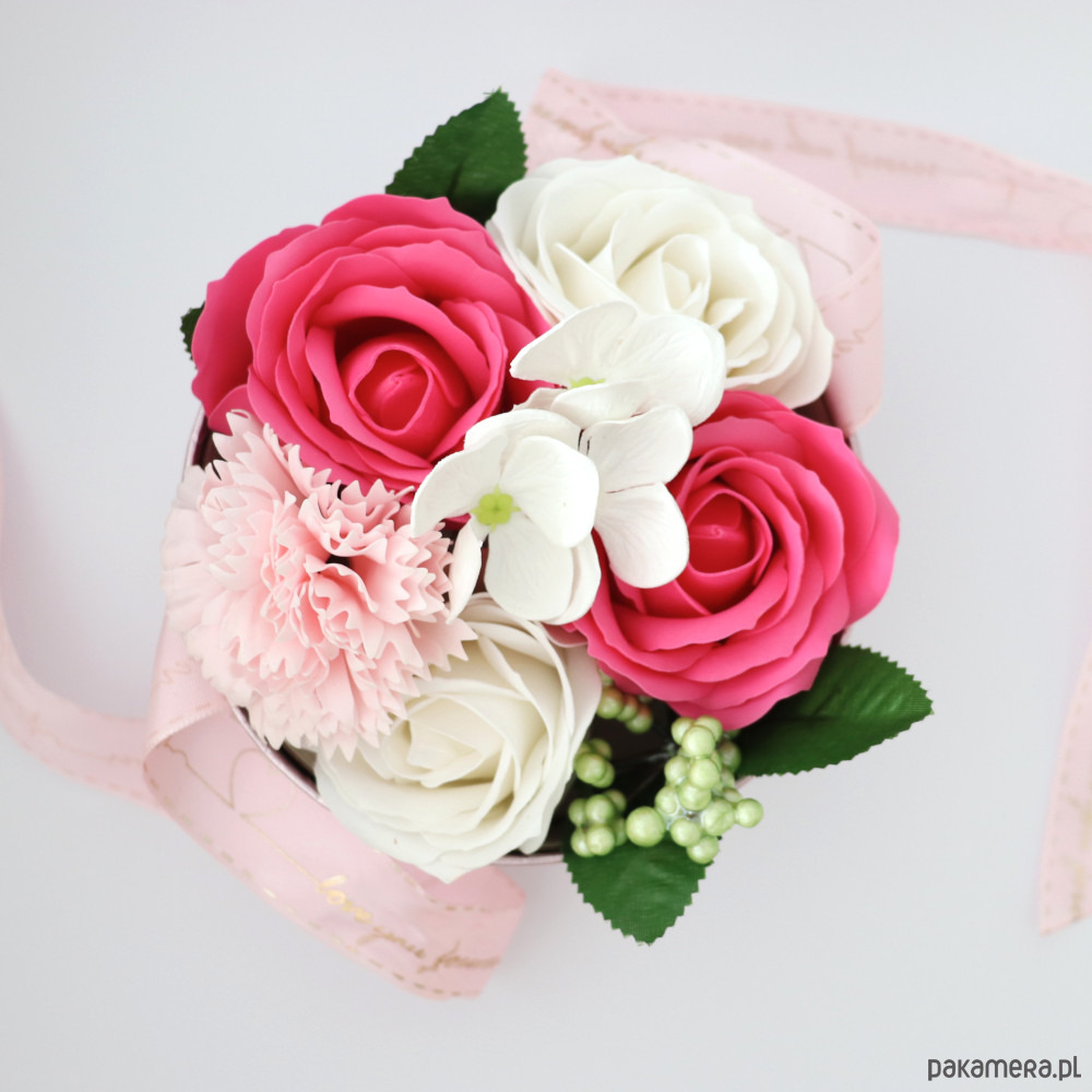 Dekoracyjne różowe pudełko wypełnione delikatnie pachnącymi różowymi i białymi różami, jasnoróżowym goździkiem i białą hortensją. Dodatki w postaci kulek i listków nie są zrobione z mydła.