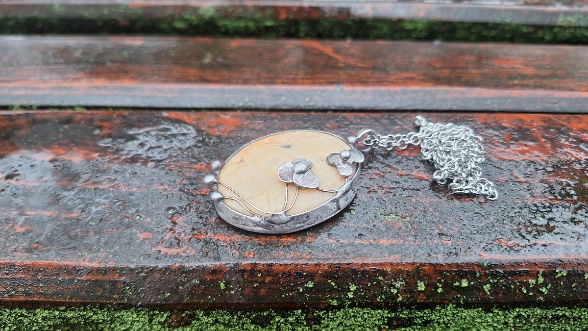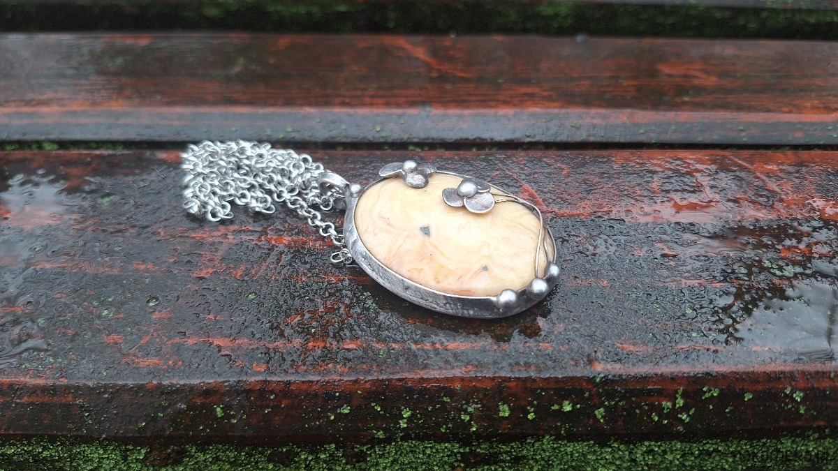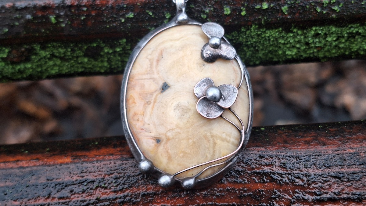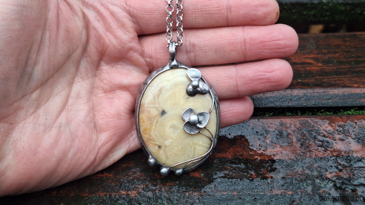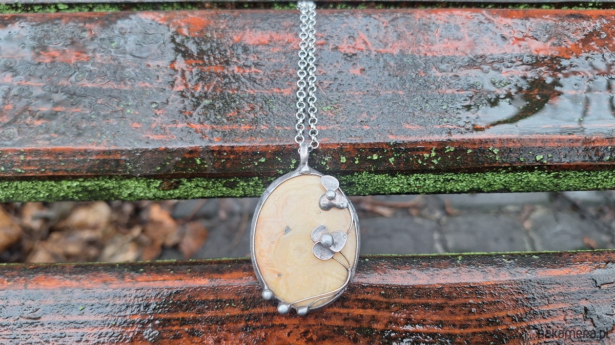 Wisiorek wykonany z miedzi, cyny i agatu crazy lace. Wymiary ok. 5 na 3.5 cm. Zawieszony na łańcuszku o długości ok. 50 cm.