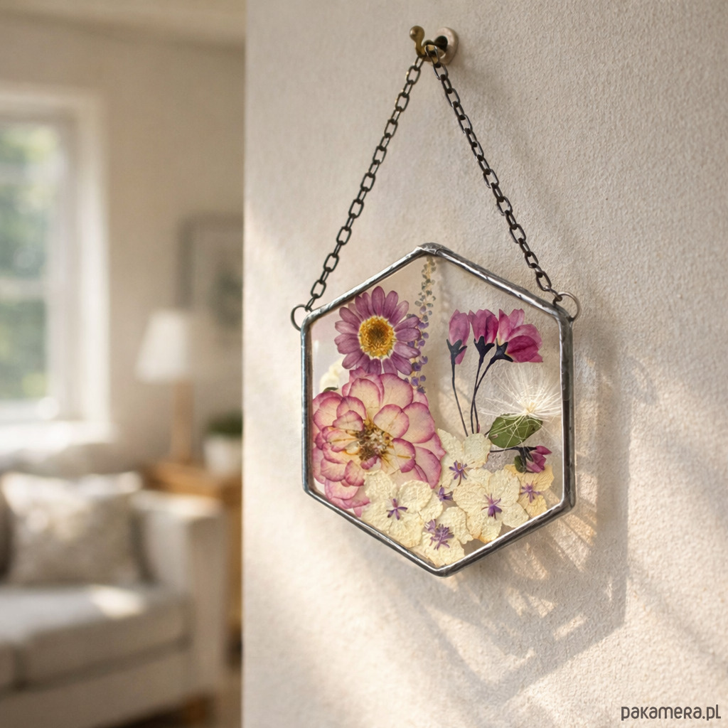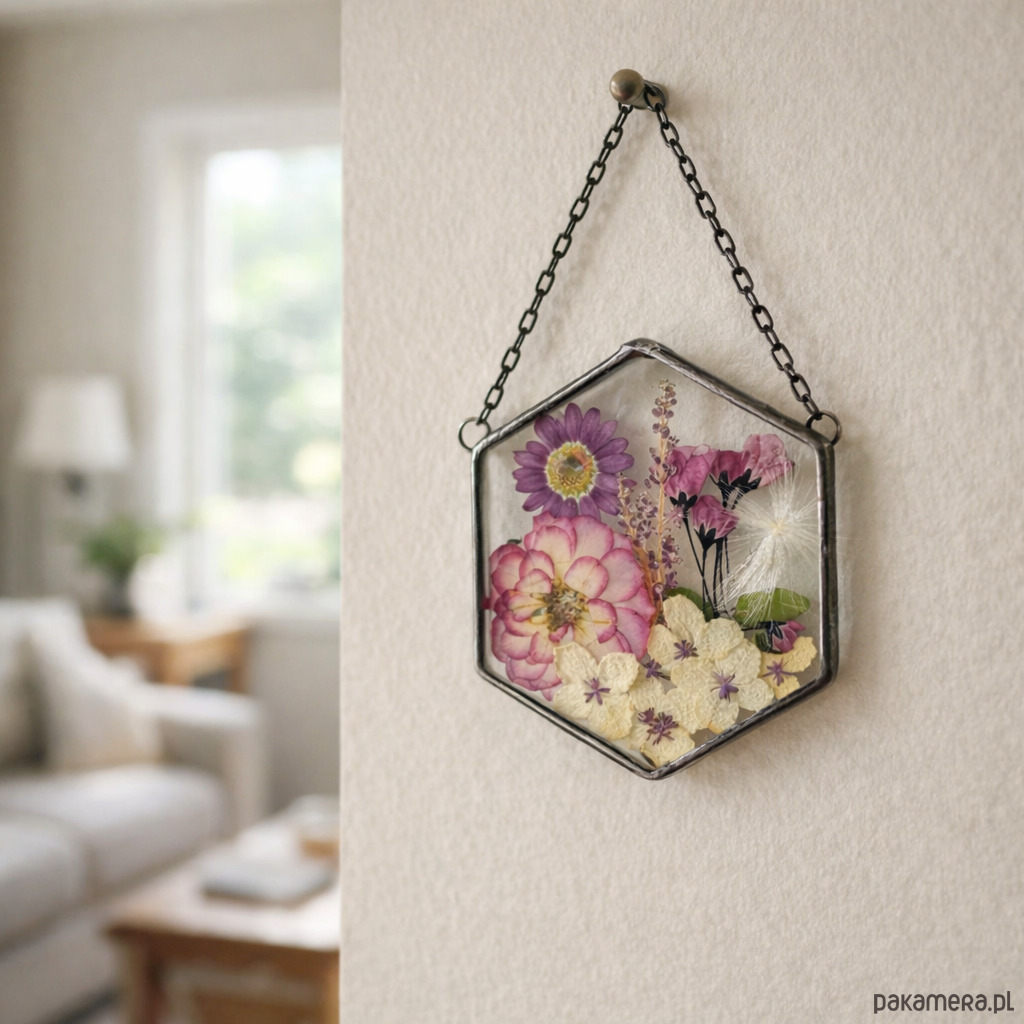 Dekor pięknie prezentuje się zawieszony w oknie lub na ścianie. Pod światło rośliny delikatnie się rozświetlają i tworzą subtelną, naturalną ozdobę wnętrza.