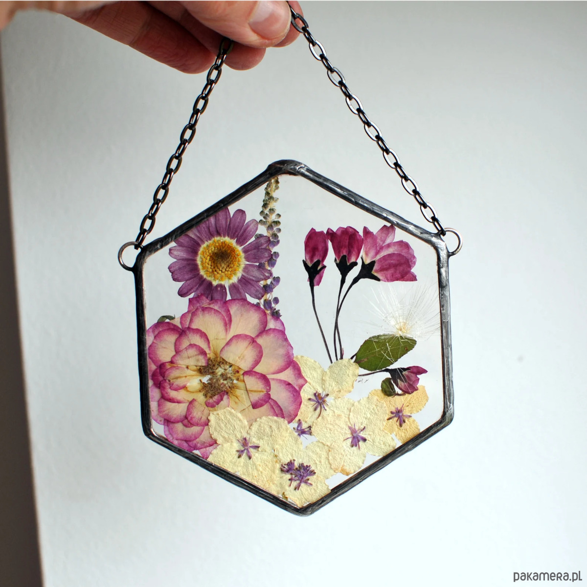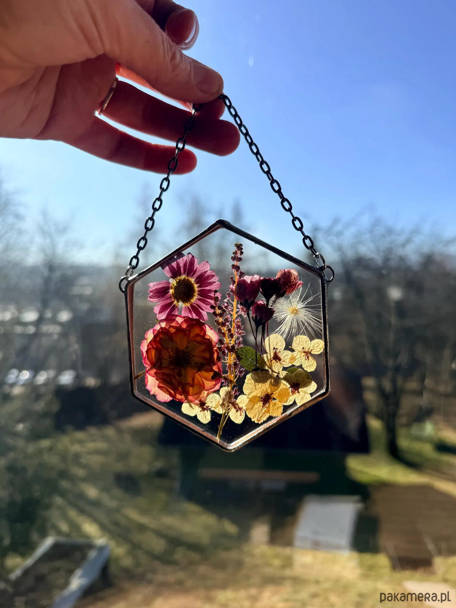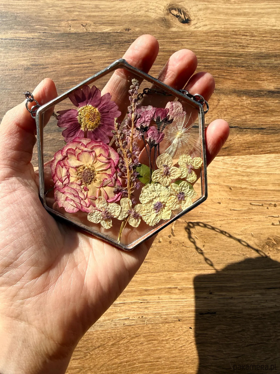 Ręcznie wykonany dekor ścienny w kształcie heksagonu z prawdziwymi suszonymi roślinami zamkniętymi pomiędzy dwiema taflami przezroczystego szkła.