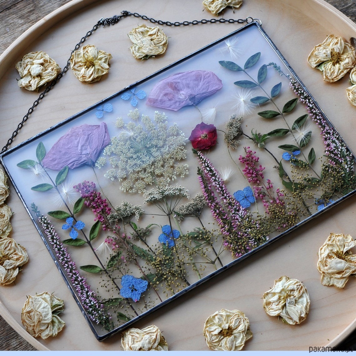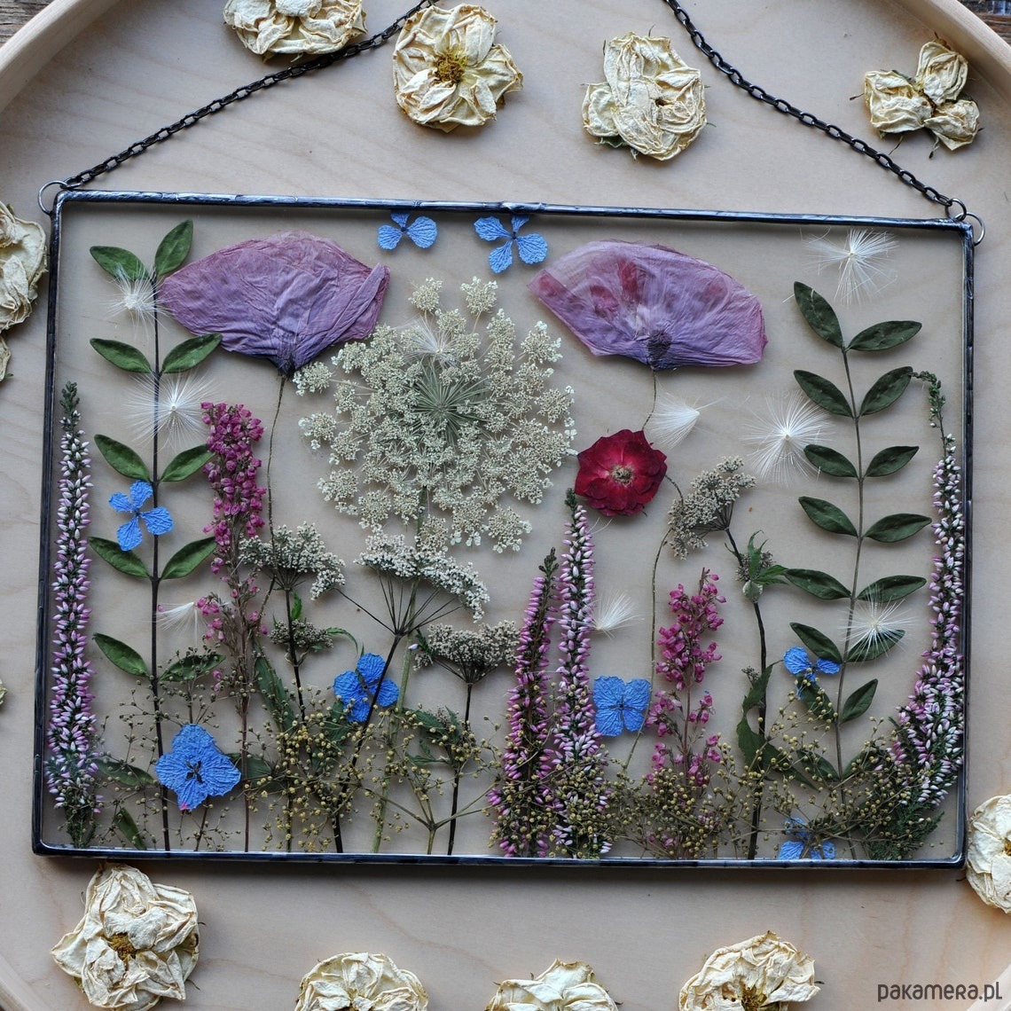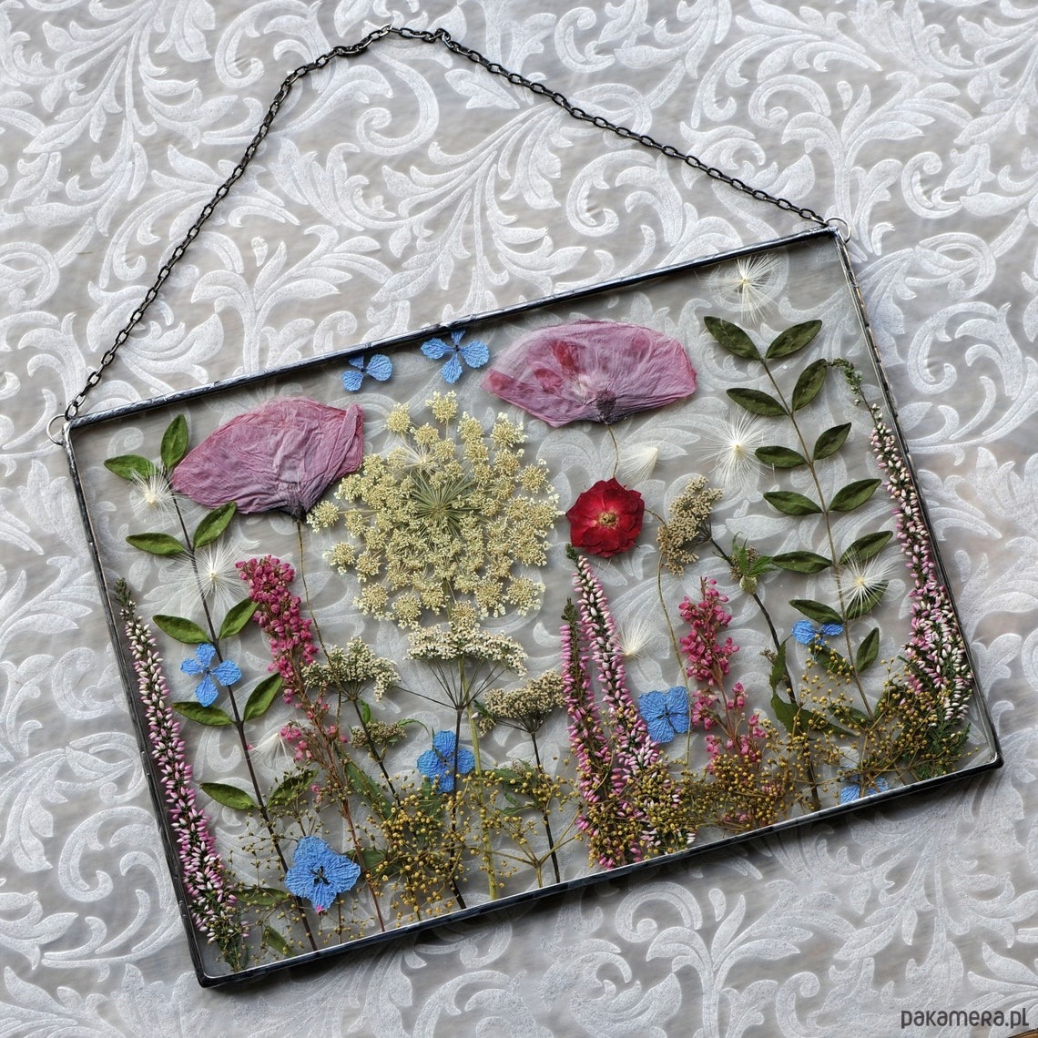 Szklany witraż formatu A4 z dekoracją z suszonych kwiatów i polnych roślin.