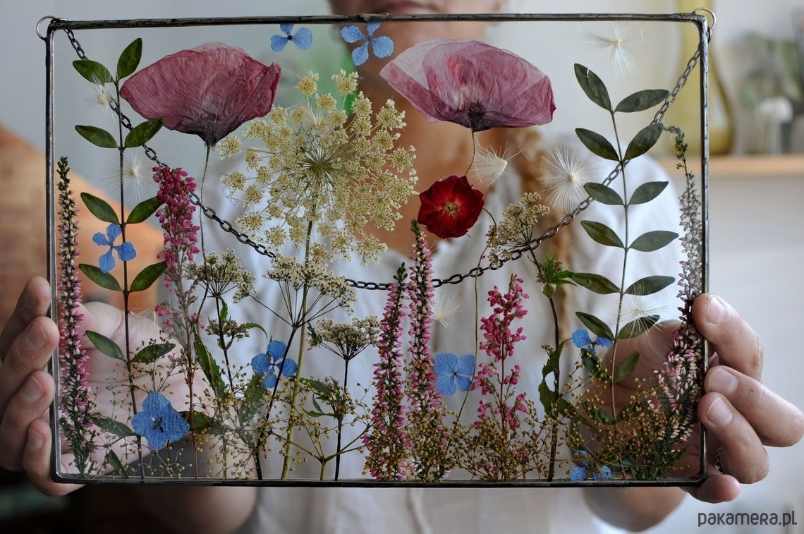 Połączenie dwóch dziedzin sztuki, sztuki suszenia i układania kwiatów i sztuki witrażownictwa.