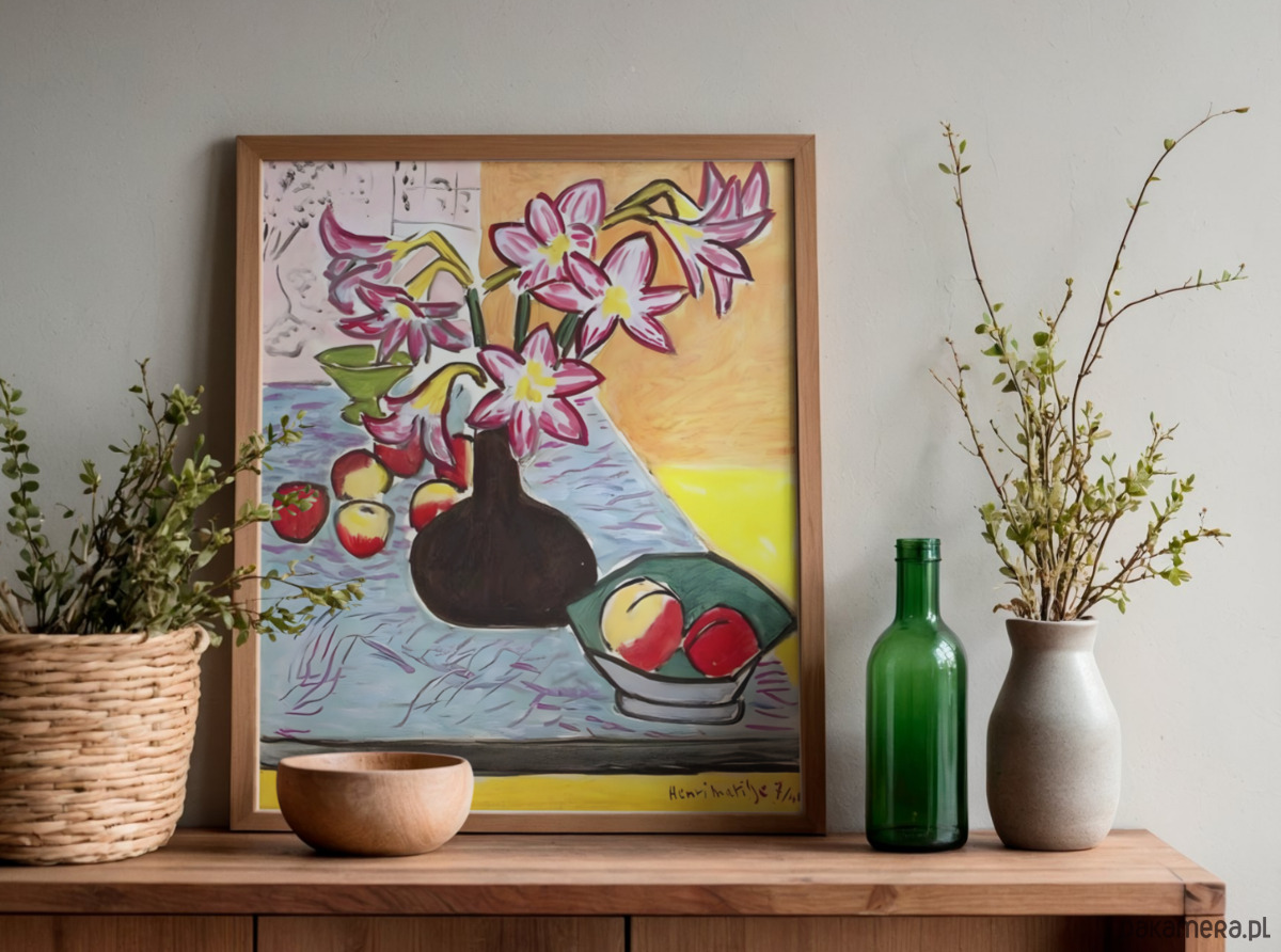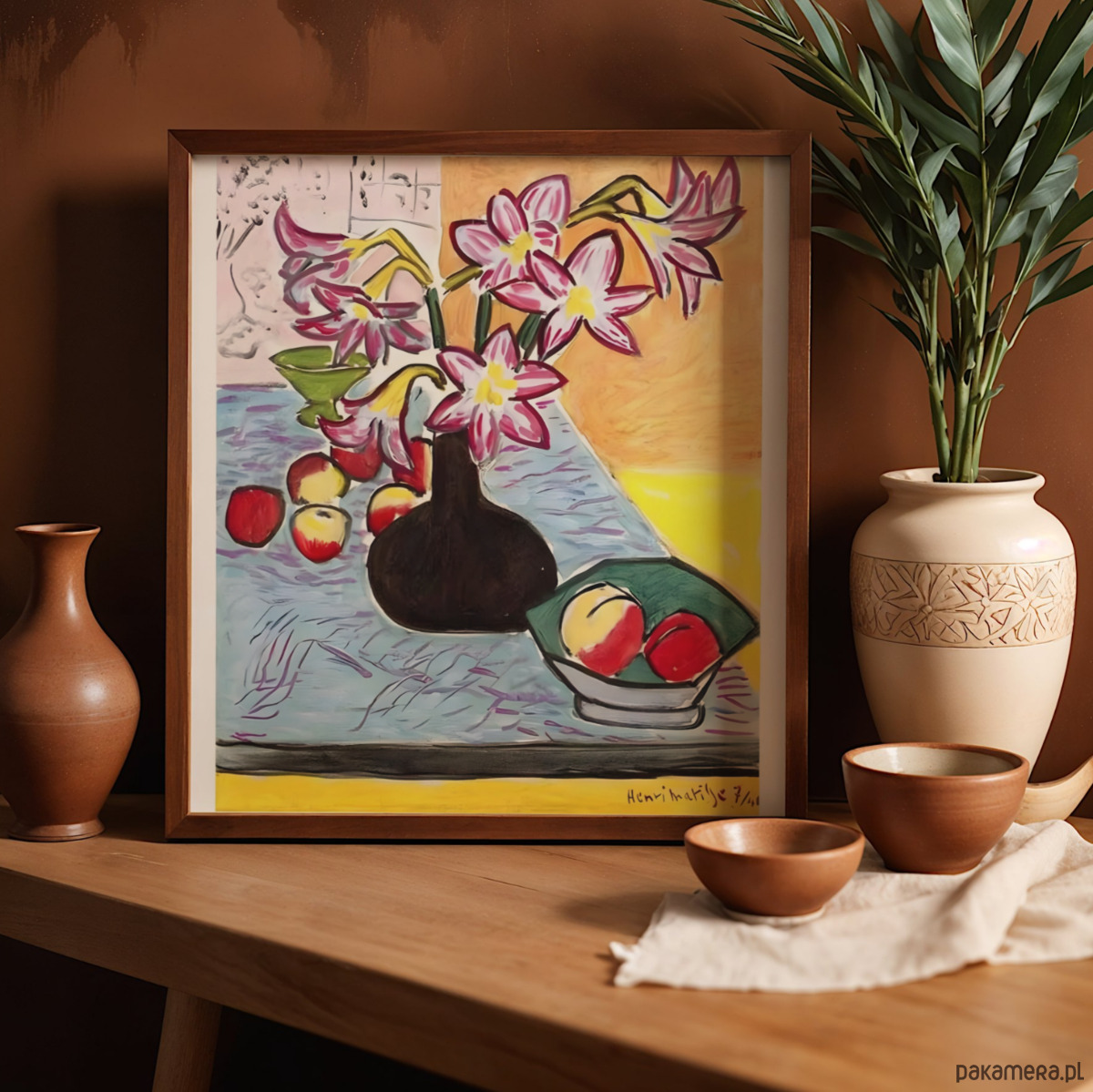 Kwiaty w wazonie grafika, kolorowa dekoracja ścienna, plakat,