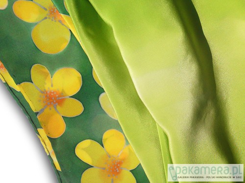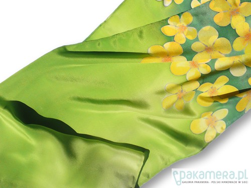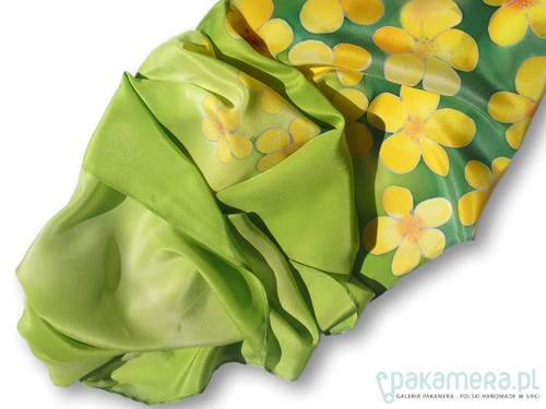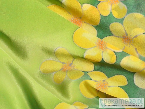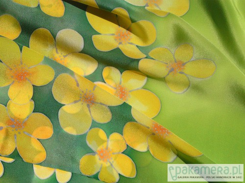 Delikatny, ręcznie malowany, jedwabny szal z motywem żółtych kwiatów letniej łąki. Tło szala dopełniają kolory zieleni traw. Rysunek opracowany srebrną guttą. Naturalny jedwab, doskonały zarówno na jesienne i zimowe chłody, jak i letnie upały. Wymiary pracy to 38x180cm. Wzór malarski zajmuje około 30% powierzchni szala. Praca opatrzona jest certyfikatem pochodzenia/autentyczności, uzupełnionym o przepis prania. Całość zamyka się w pięknym opakowaniu z ozdobnego kartonu, przepasanym rafią.