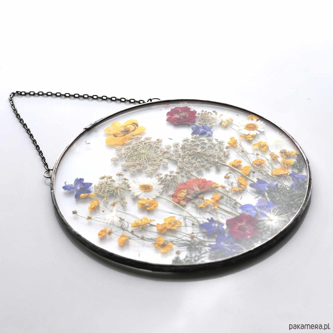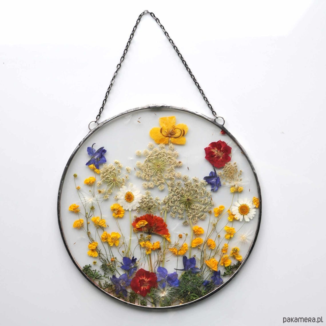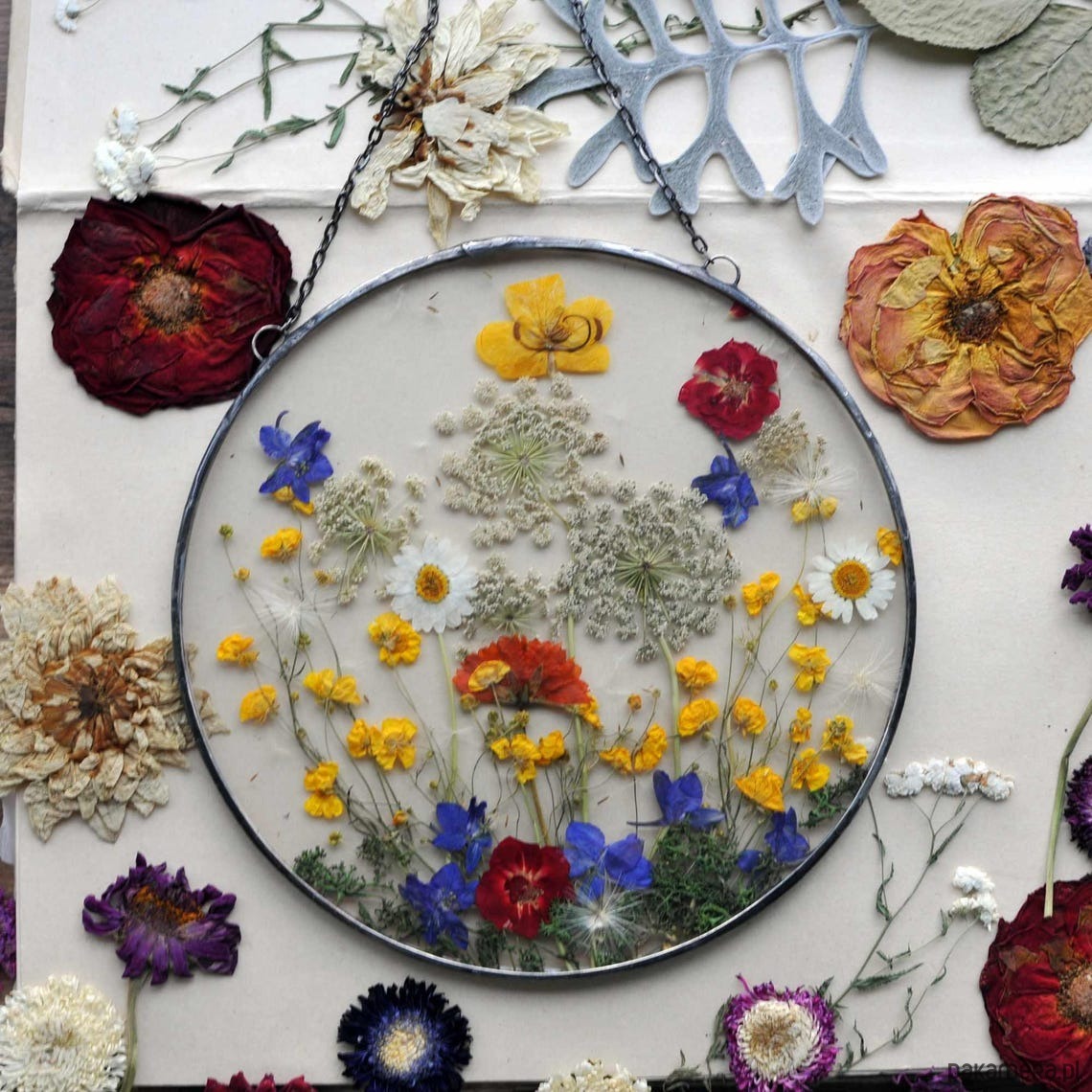 Dekoracyjny witraż z kompozycją z suszonych roślin wykonany w całości w pracowni rękodzieła MARIAELA.