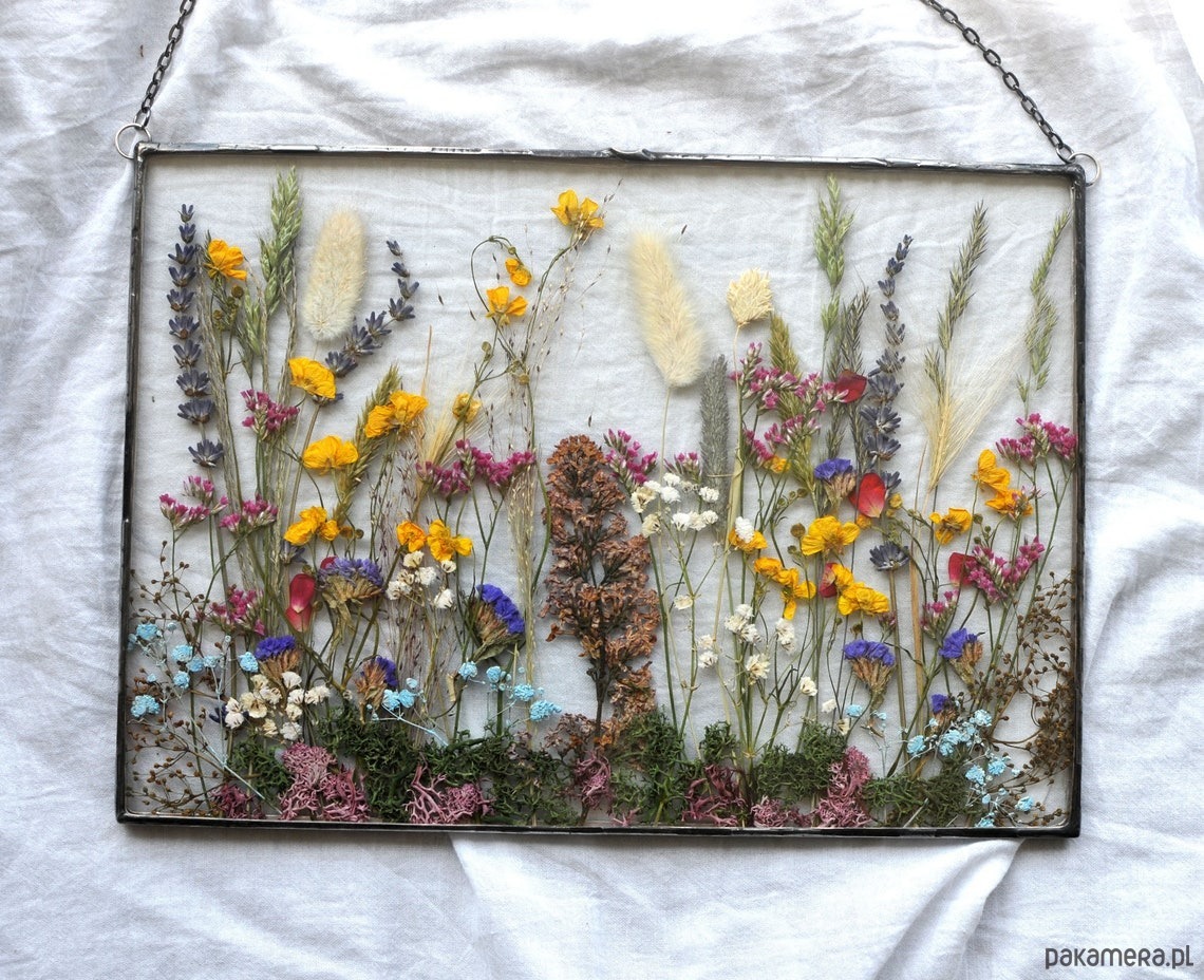 Szklany witraż formatu A4 z dekoracją z suszonych kwiatów i polnych roślin.