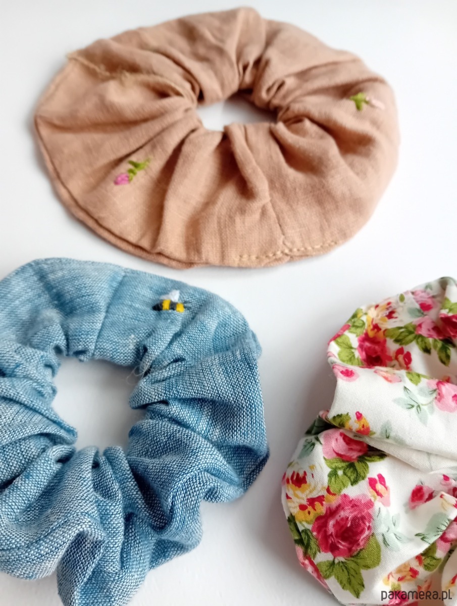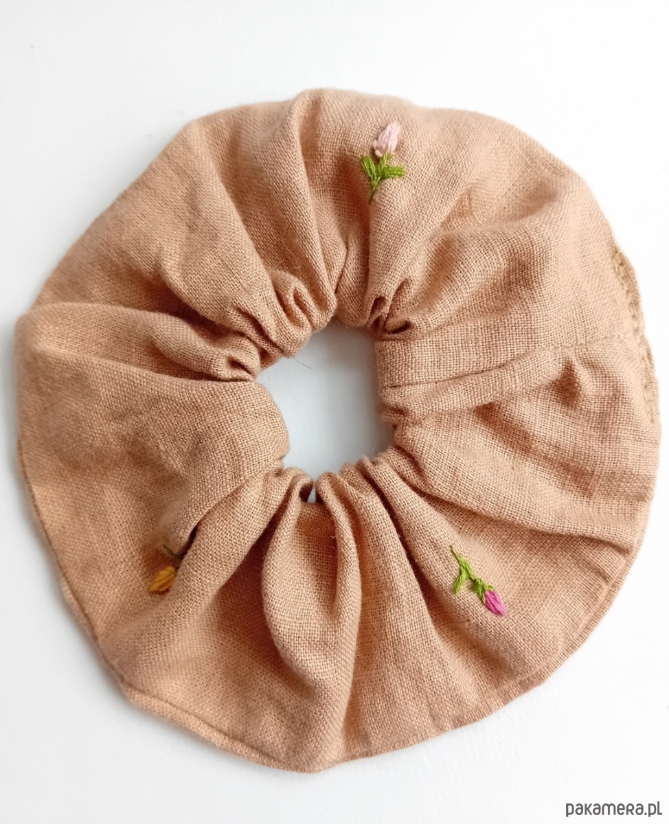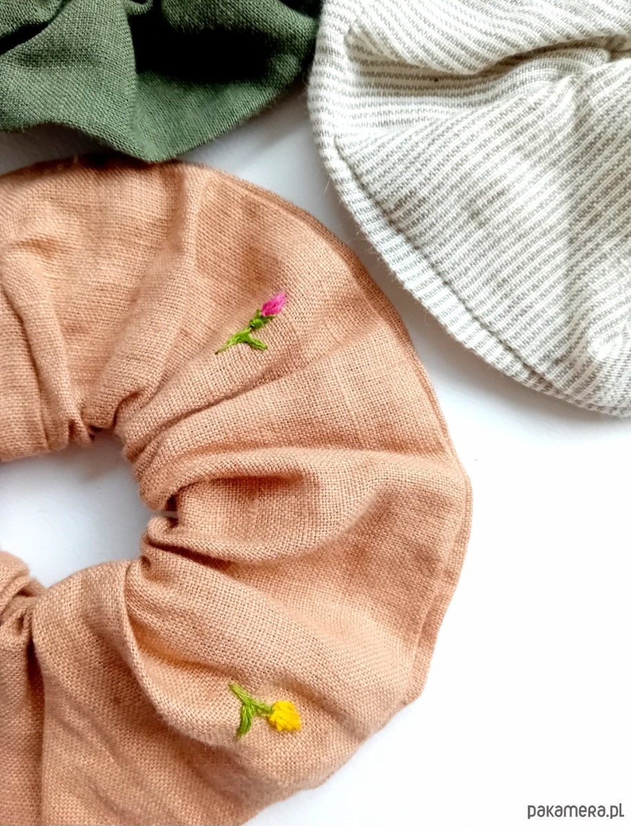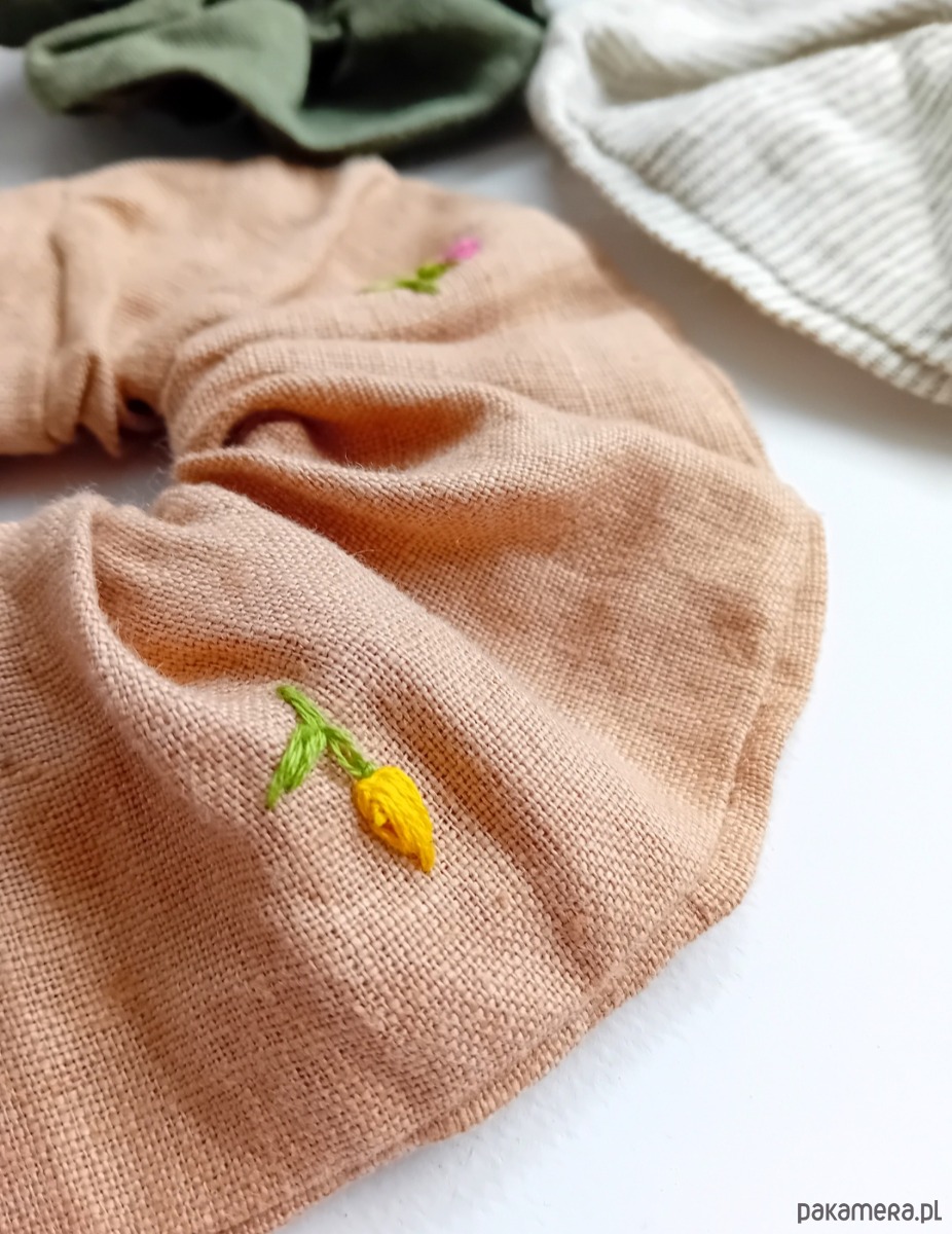 Ręcznie uszyta gumka do włosów z lnu, z haftowanymi kwiatkami