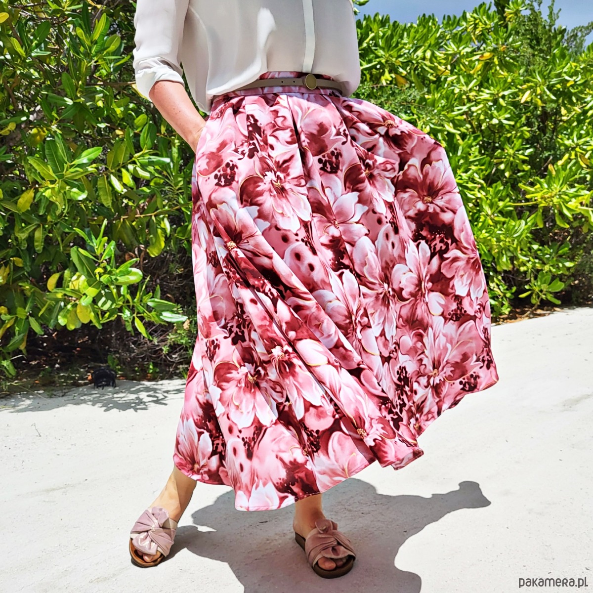 Kwiecista, lejąca spódnica szyta z koła z licznymi zakładkami i wysokim stanem.