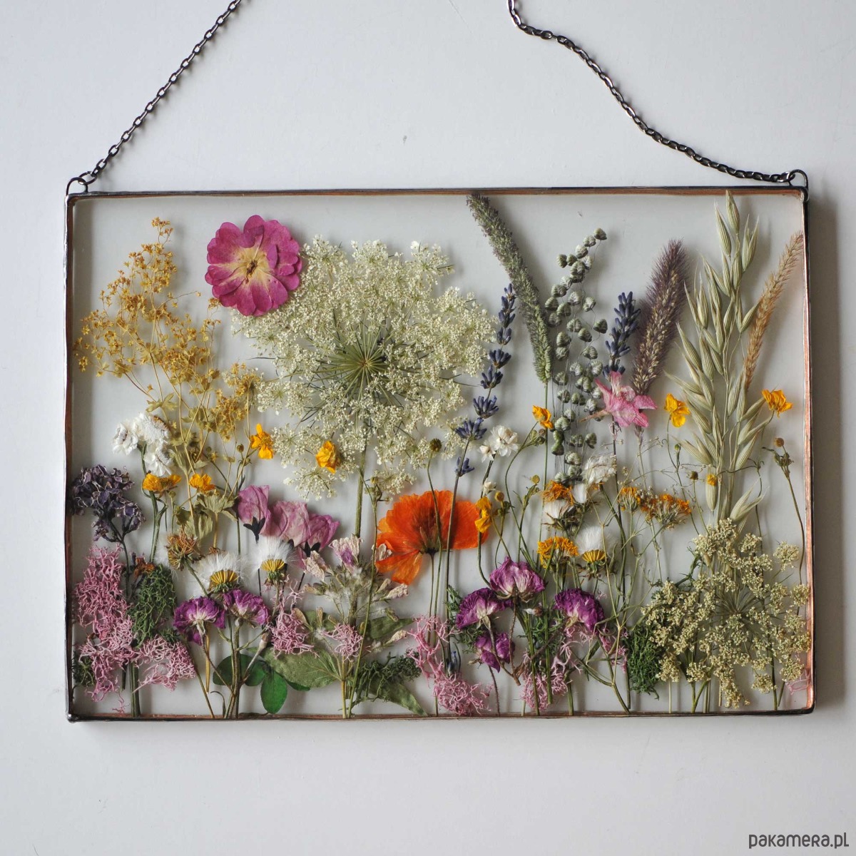 Szklany witraż formatu A4 z dekoracją z suszonych kwiatów i polnych roślin.