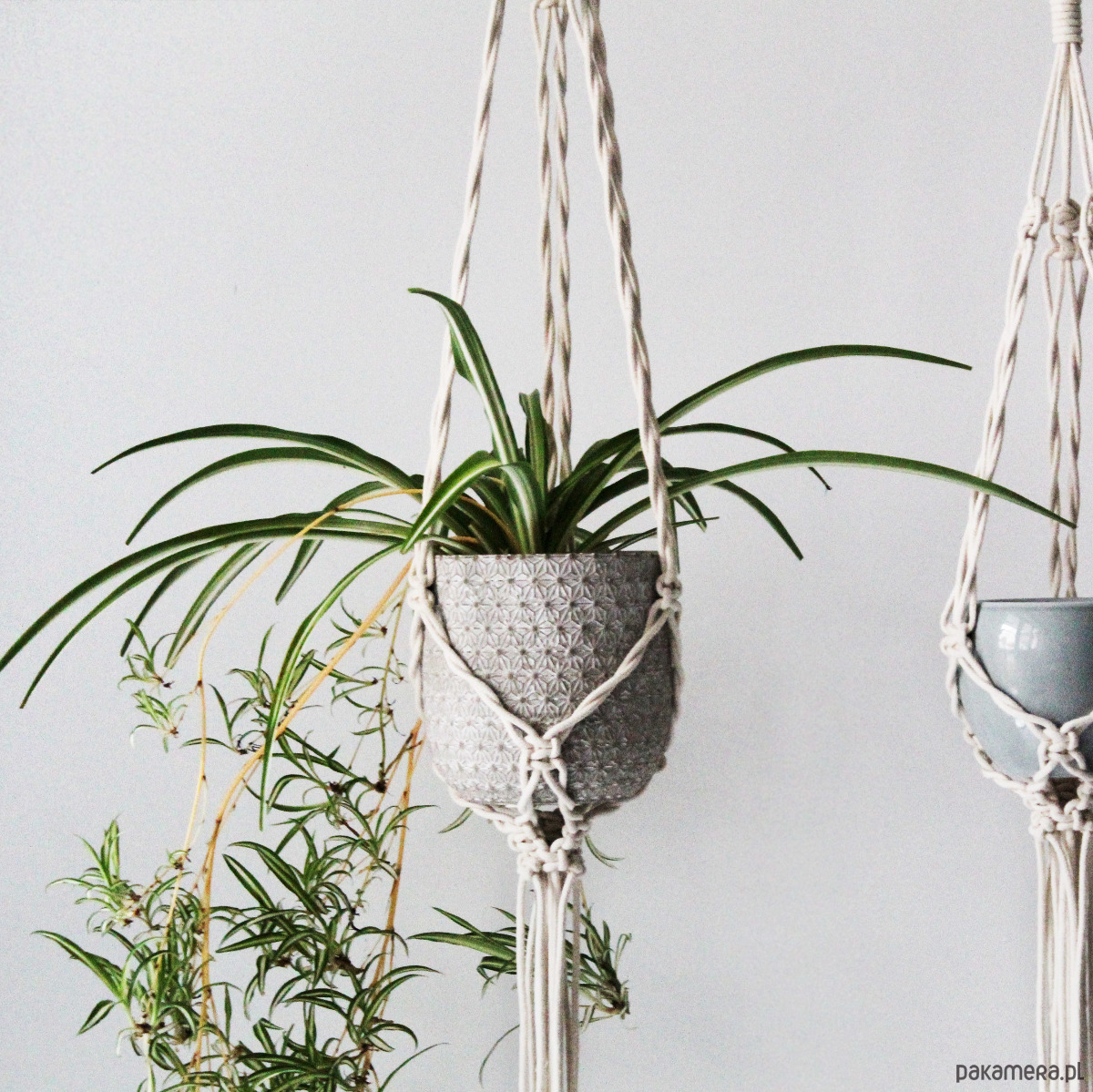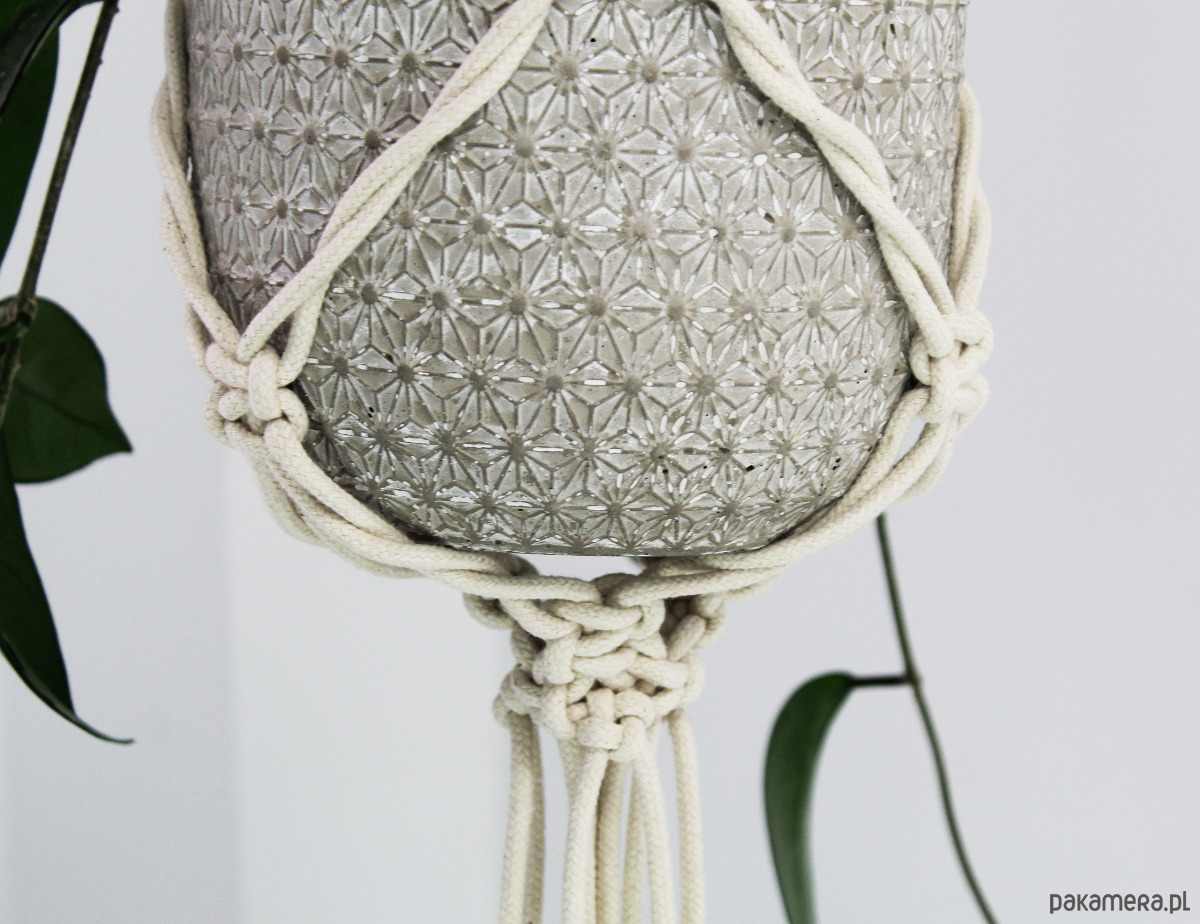 Kwietnik wyplatany ręcznie z naturalnego sznurka bawełnianego (techniką makramy). Wdzięczna ozdoba. Lekka, smukła konstrukcja.