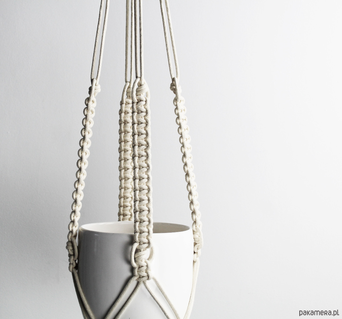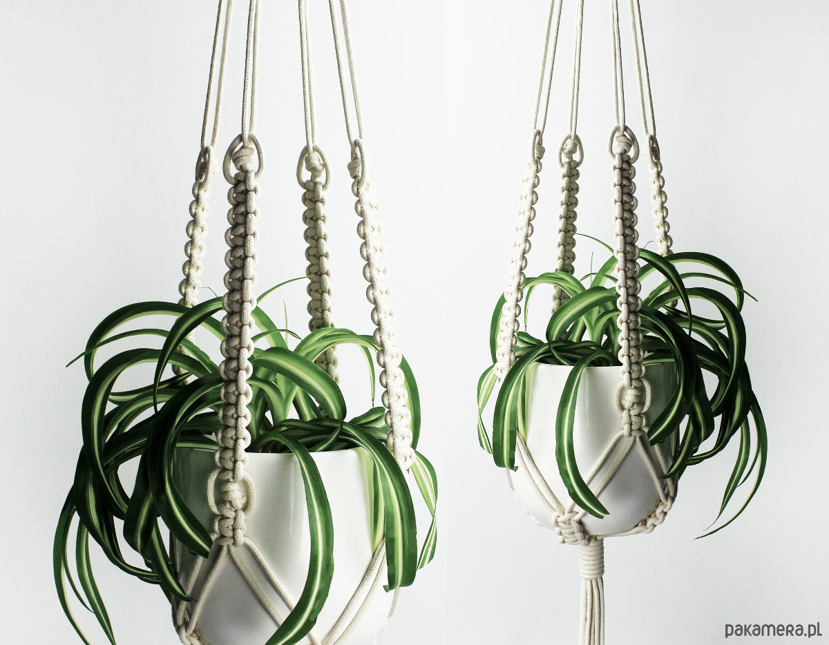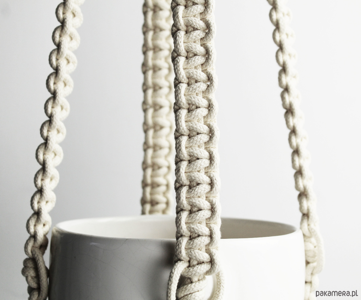 Prosty kwietnik wyplatany ręcznie techniką makramy. Minimalistyczny styl.