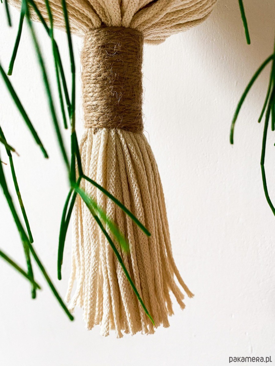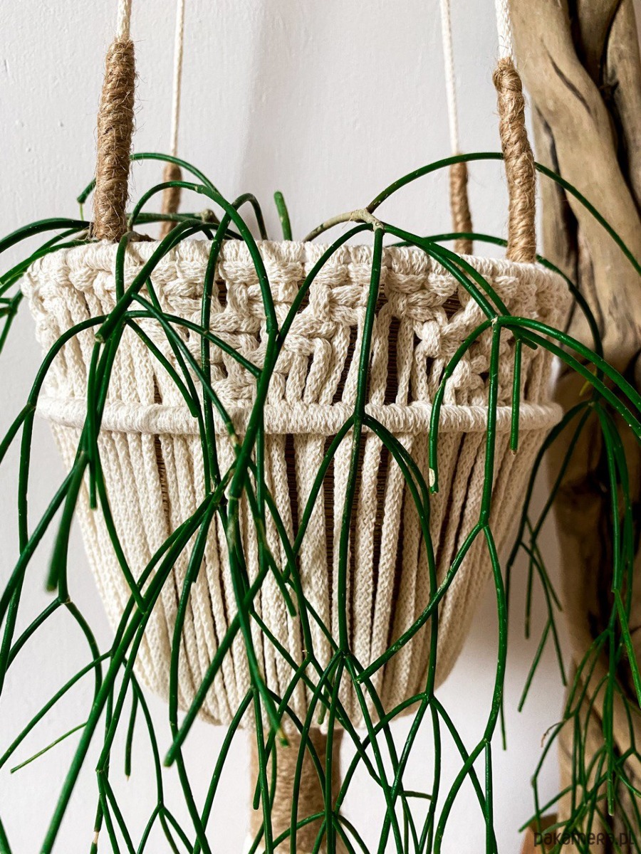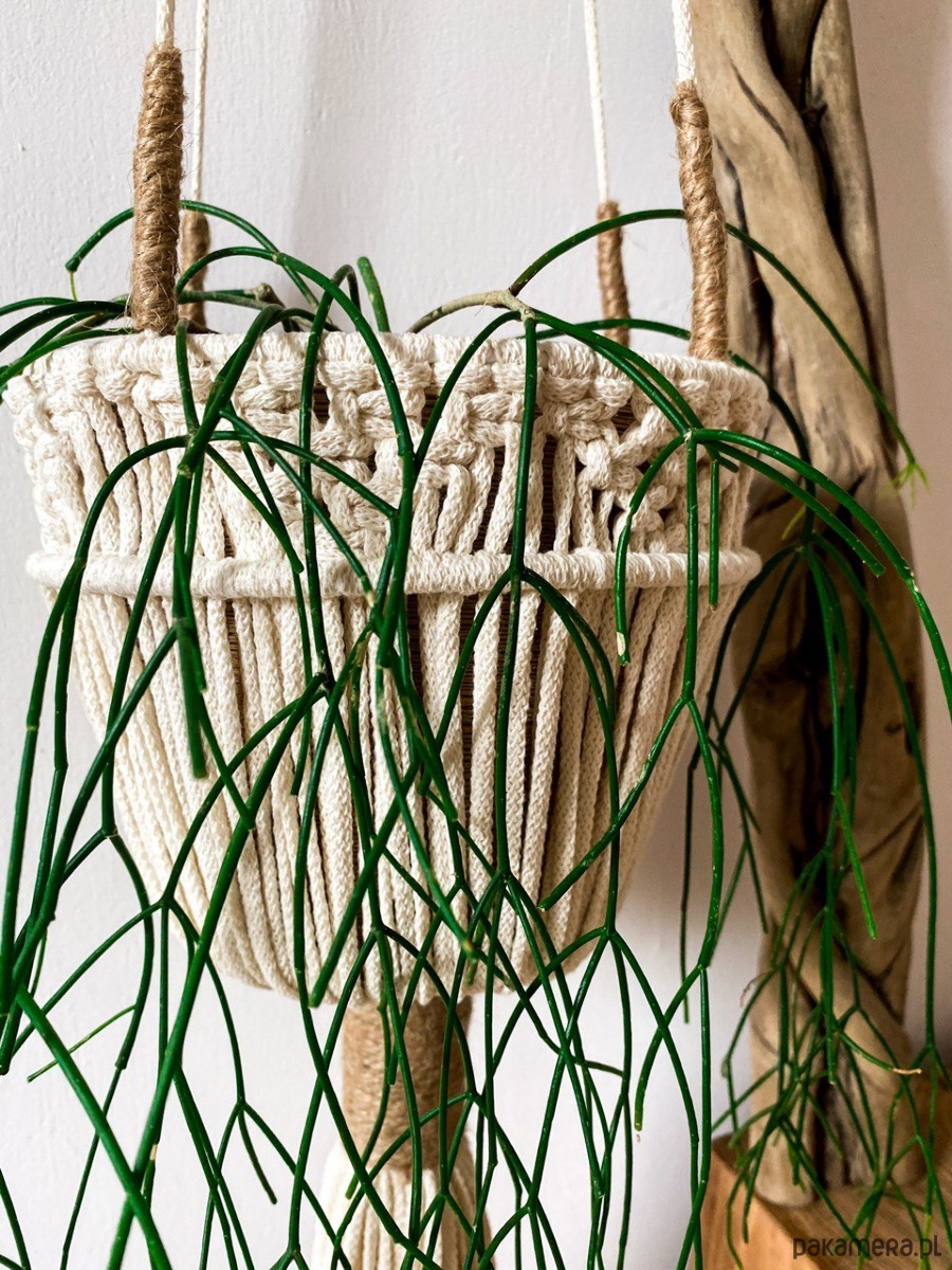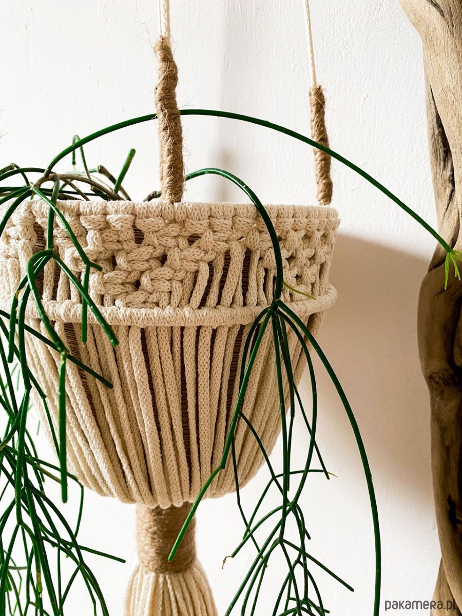 kwietnika z makramy dostosowany jest do doniczki zarówno o płaski jak i okrągłym spodzie.