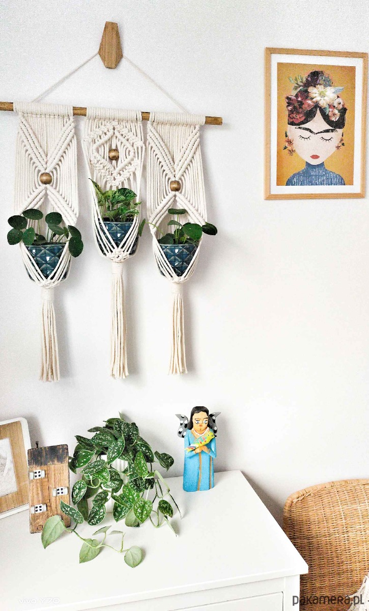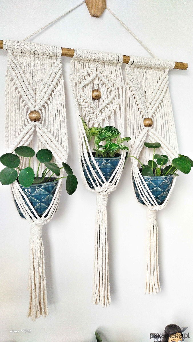 Kwietnik makrama potrójny, na ścianę, wiszący.